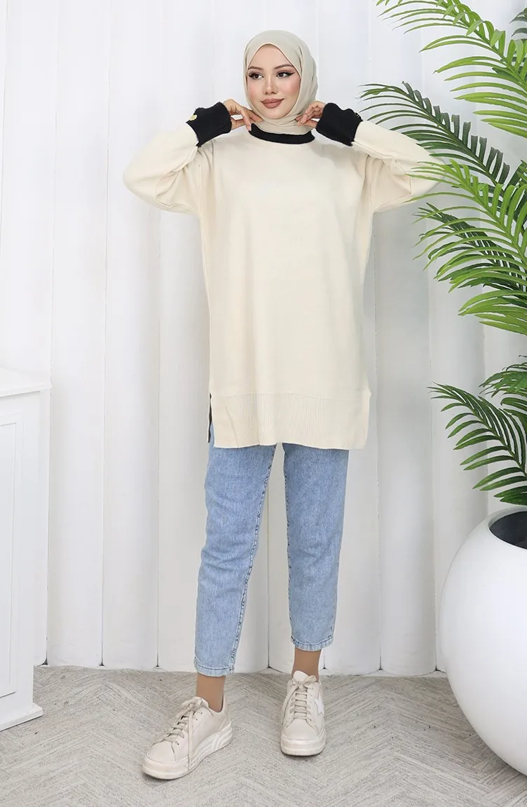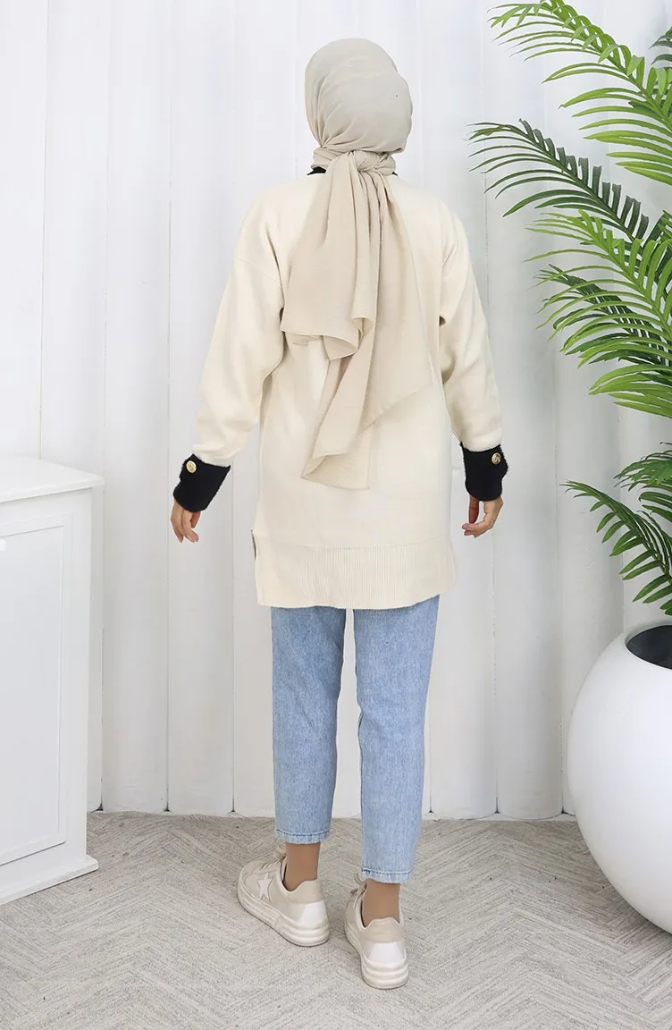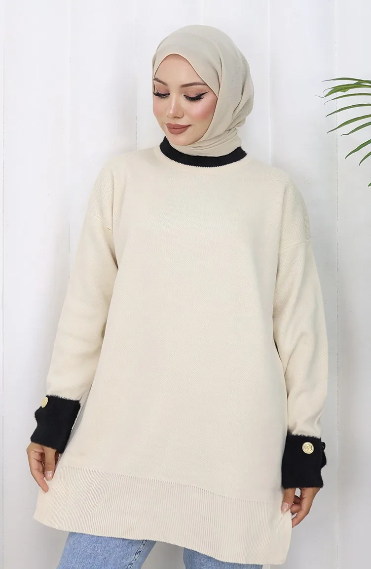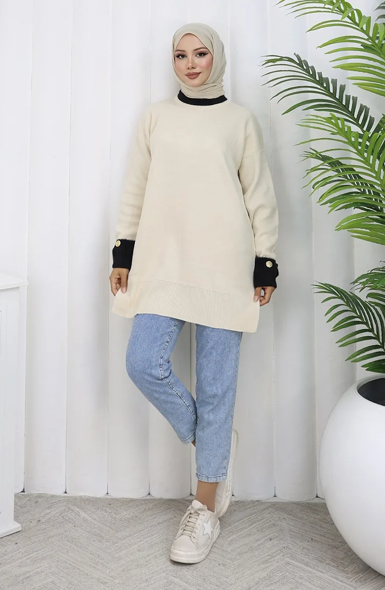 Tunique Tricotée Avec Détail Boutonné Sur La Manche 3000-07 Beige 3000-07
