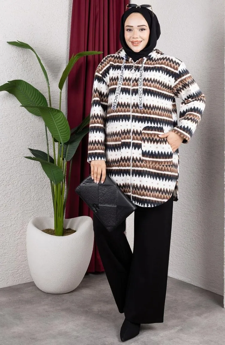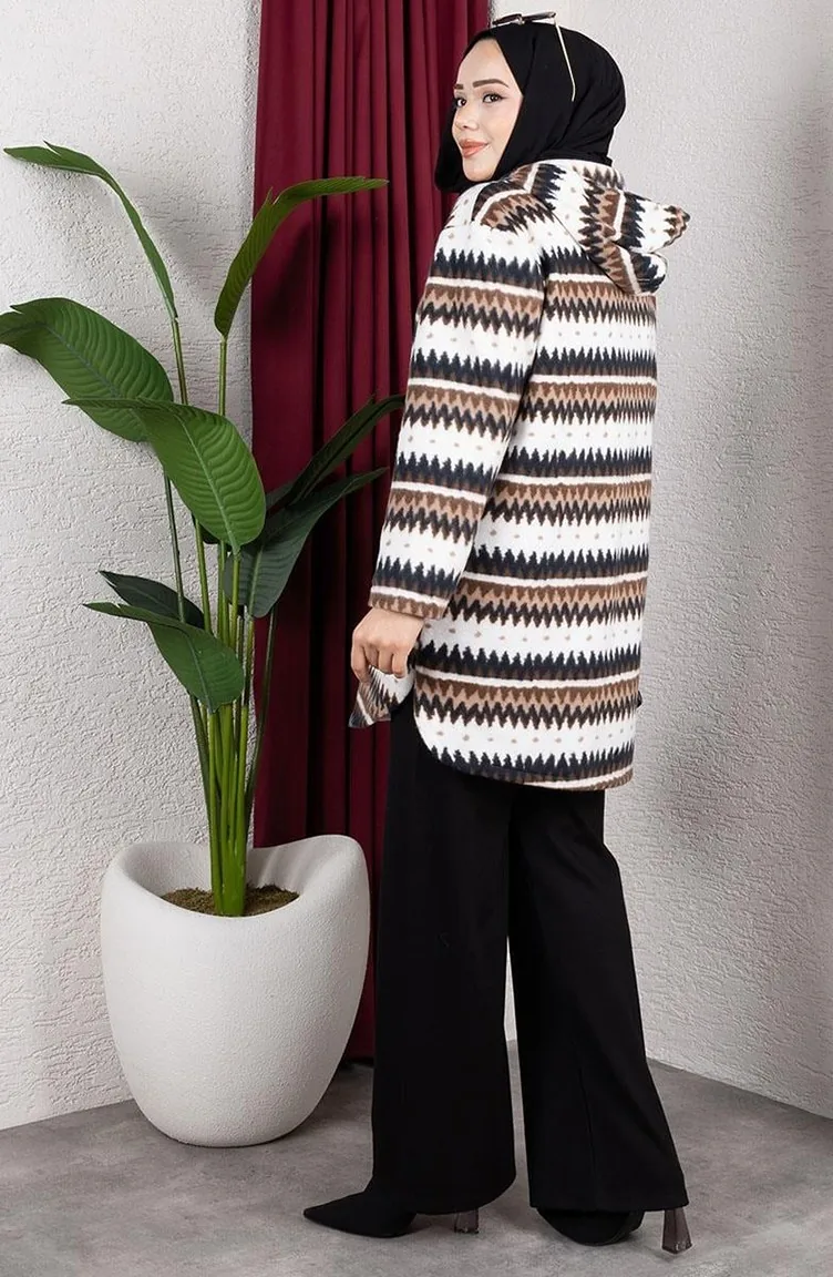 Desenli Kapüşonlu Peluş Hırka 2062-09 Kahverengi