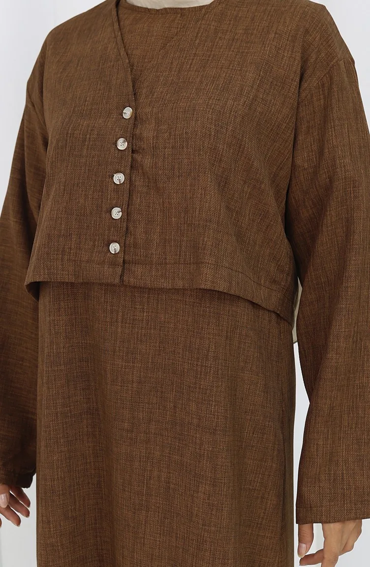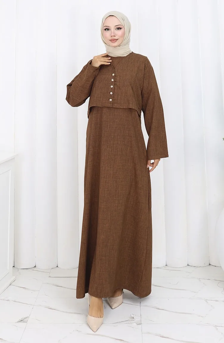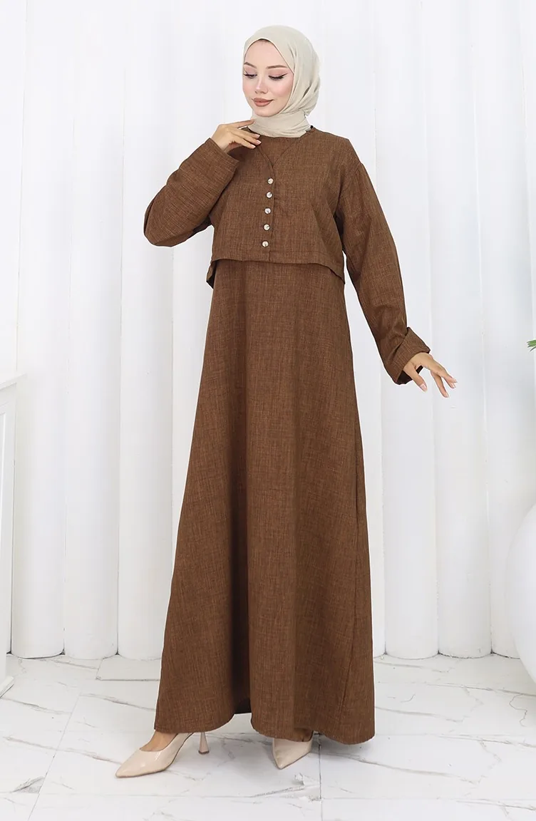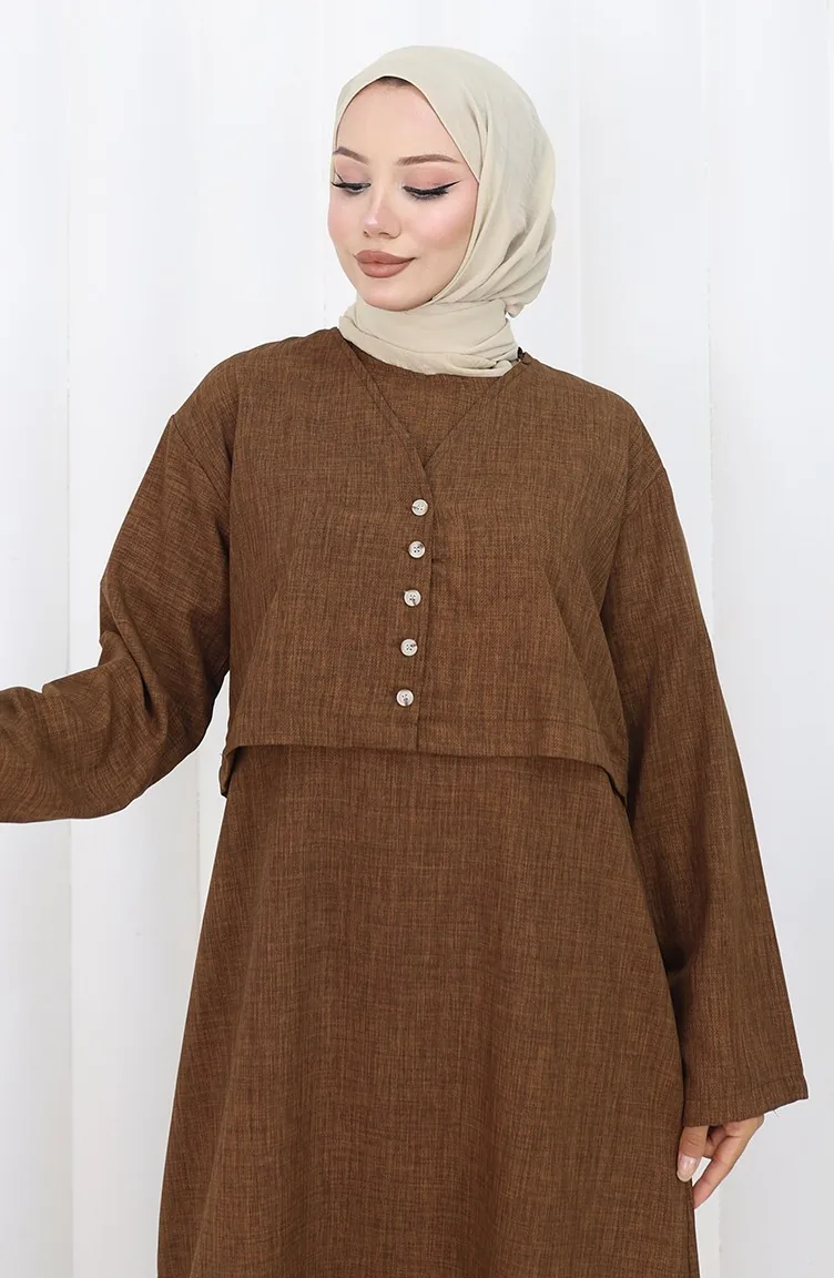 Kahverengi renktedir. Pamuk dokuma kumaş. Sade. Düğmeli. Sıfır yaka detayı ile rahat kullanıma sahiptir. 4 Mevsim tercih edebilirsiniz. Büyük beden seçeneği mevcuttur.