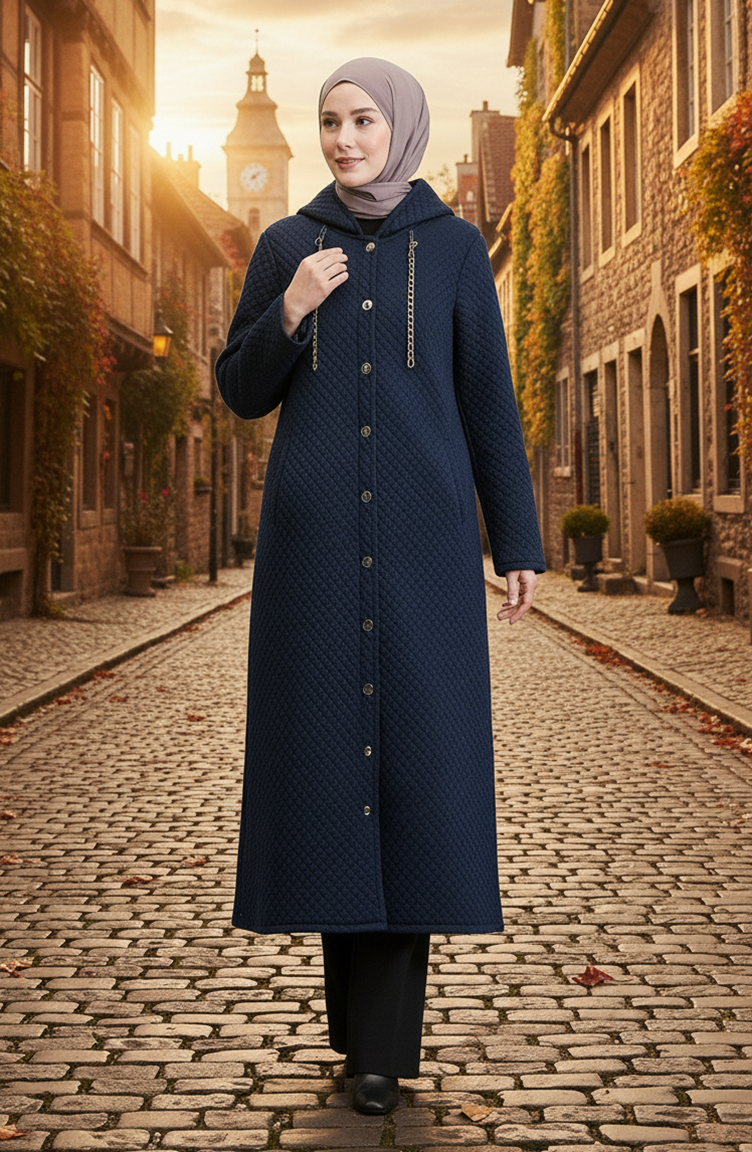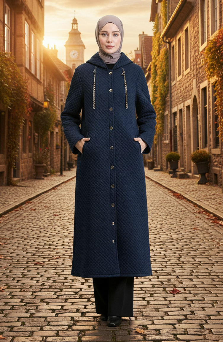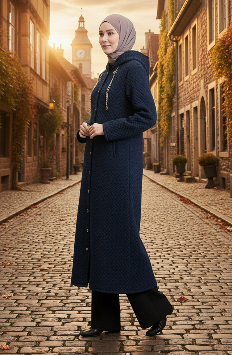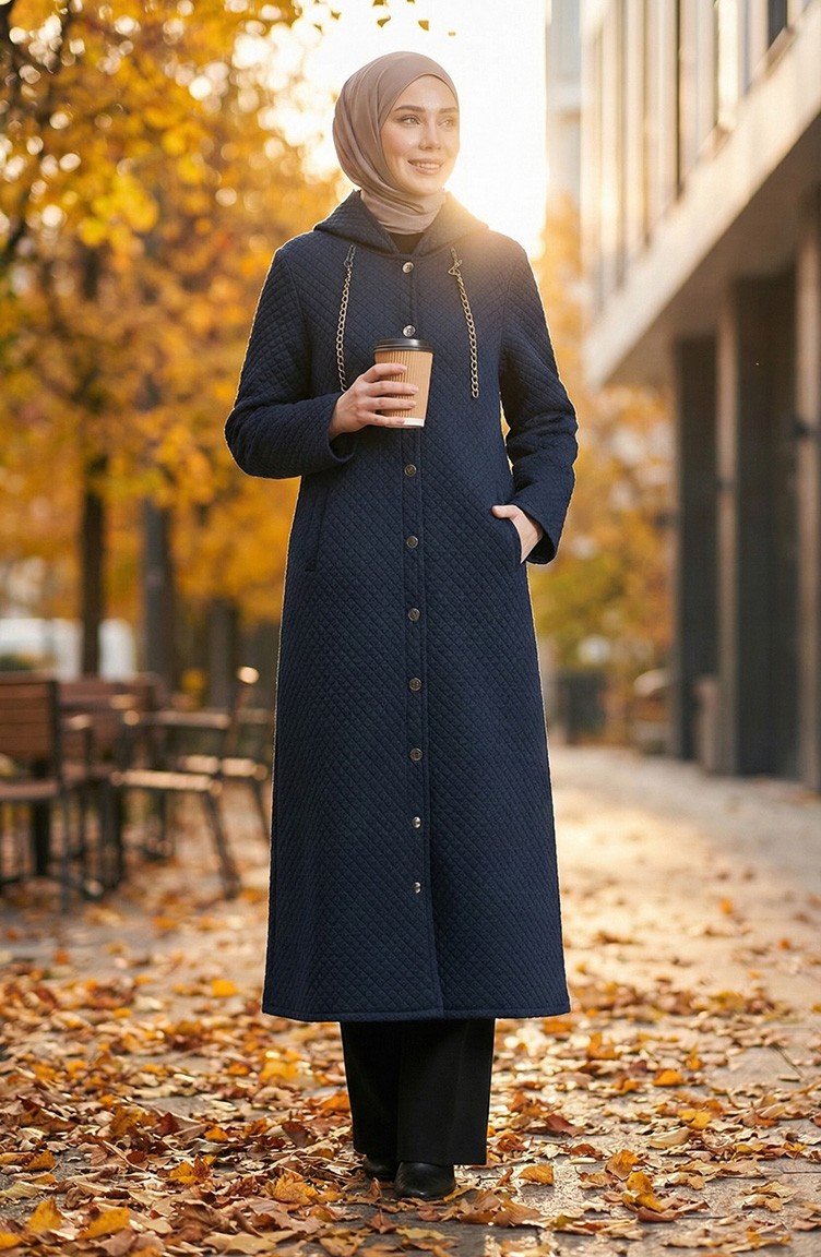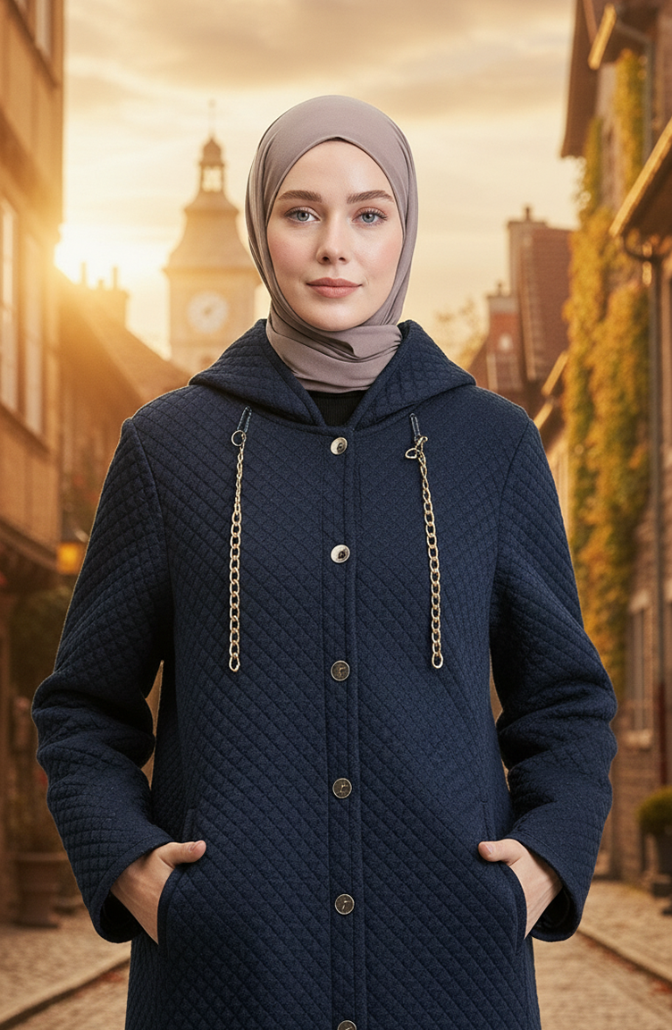 Zincir Detaylı Kapüşonlu Kapitone Kaban 0215-01 Lacivert