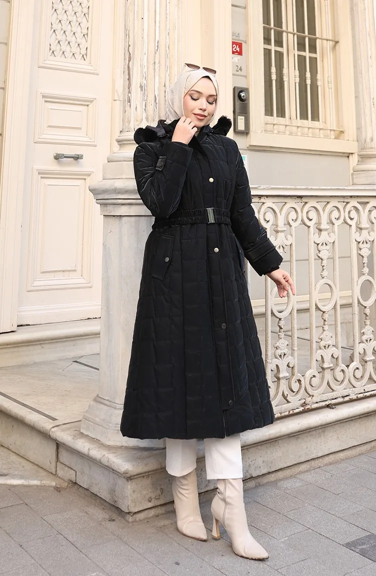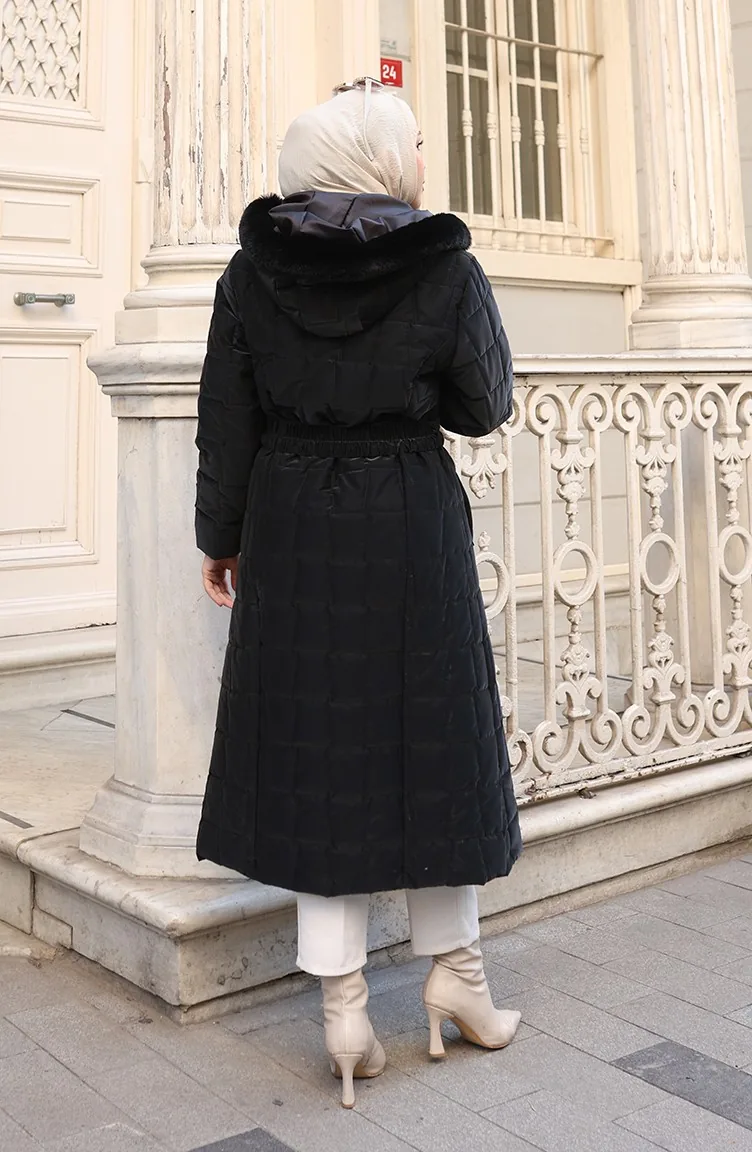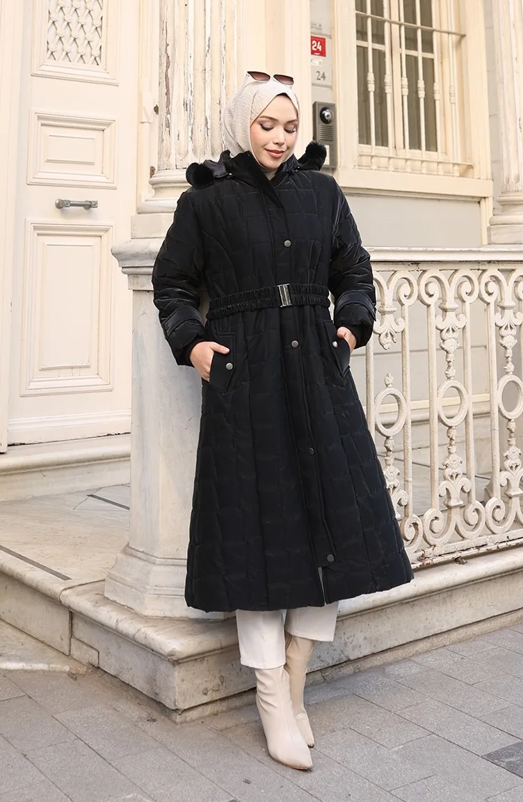 Büyük Beden Kapüşonlu Kemerli Mont 6322-01 Siyah