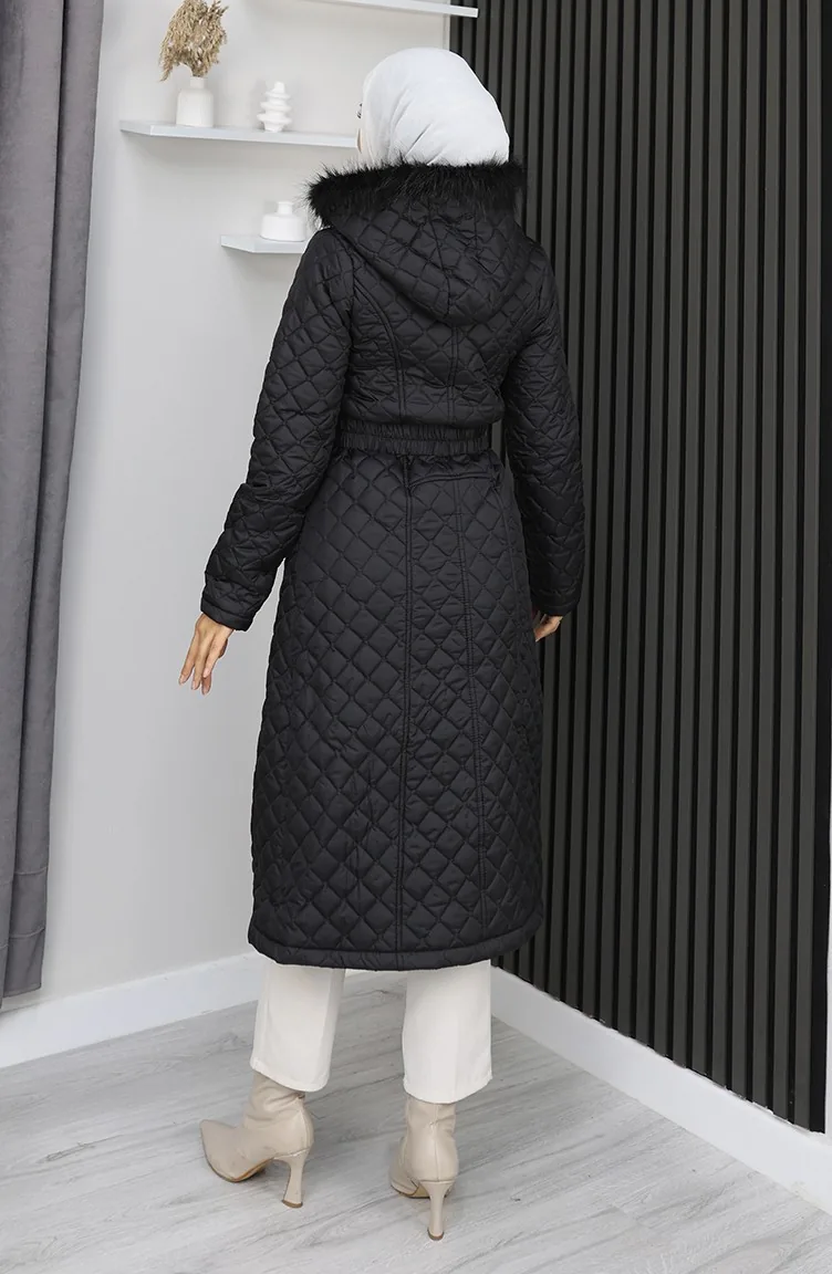 Siyah renktedir. Kapitone. Sade. Kemerli. Kışlık. Standart.