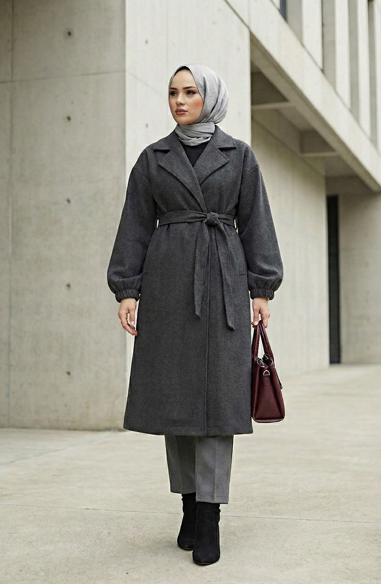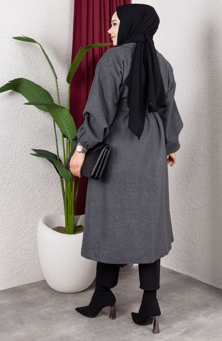 Antrasit renktedir. Kaşe kumaş. Sade. Kuşaklı'dır. Lastik kollu. Kışlık. Şık. Büyük beden seçeneği mevcuttur.