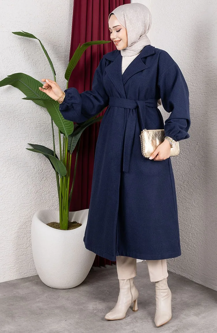 Kış zarafetinin lacivert tonu: Lacivert Kruvaze Yaka Kuşaklı Tesettür Kaşe Kaban! Kalın kaşe kumaşı sayesinde en soğuk günlerde bile lüks sıcaklık sağlar. Klasik kruvaze (şal) yaka tasarımı ve bağlamalı kuşağı ile beli vurgulayarak zarif bir silüet oluşturur. Manşetleri lastikli puf kol detayı modern ve şık bir hava katar. Diz altı boyu ve asil rengiyle hem günlük hem de özel günler için ideal tesettür dış giyim parçasıdır.