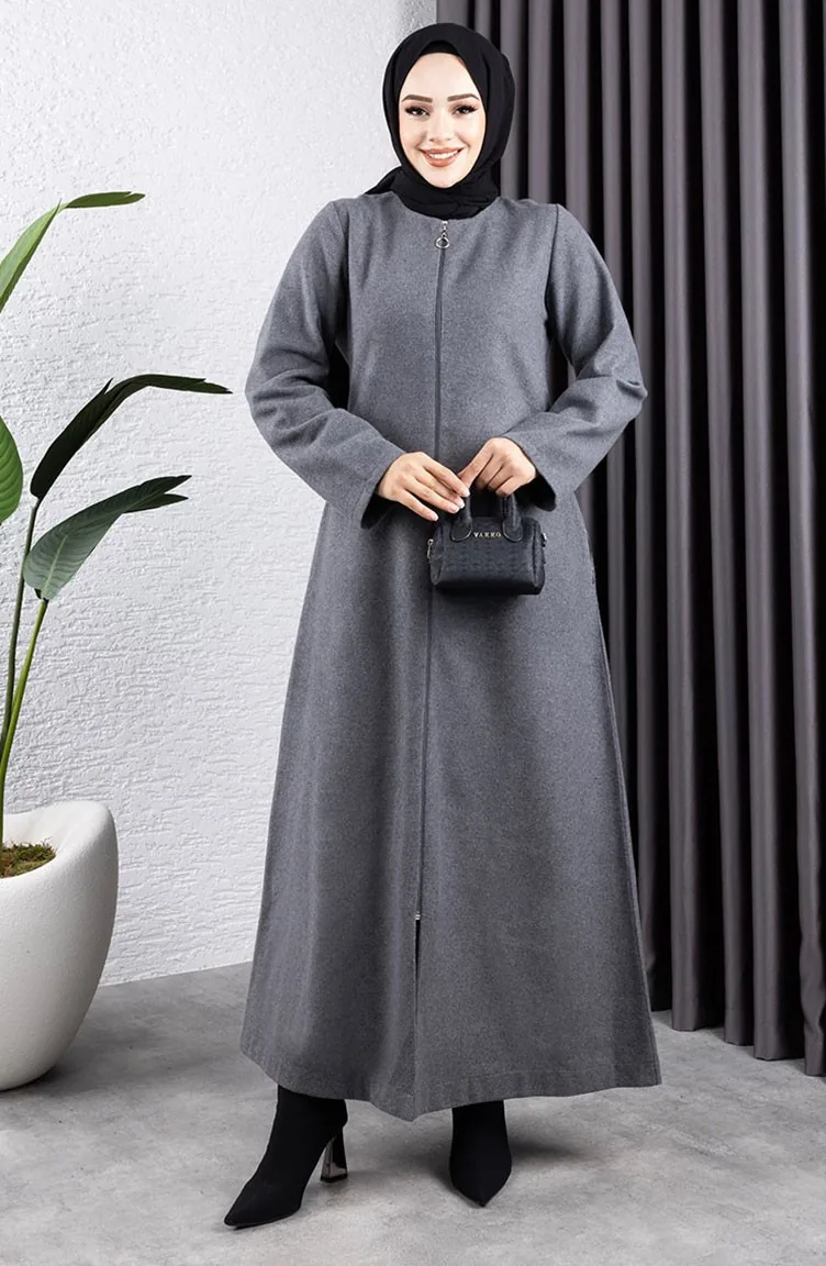 Gri renktedir. Kaşe kumaş. Sade. Astarsız. Kışlık. Büyük beden seçeneği mevcuttur.