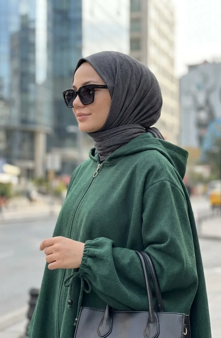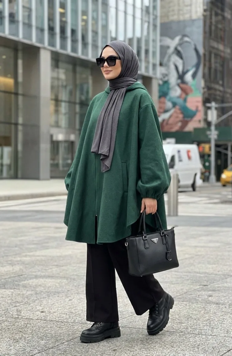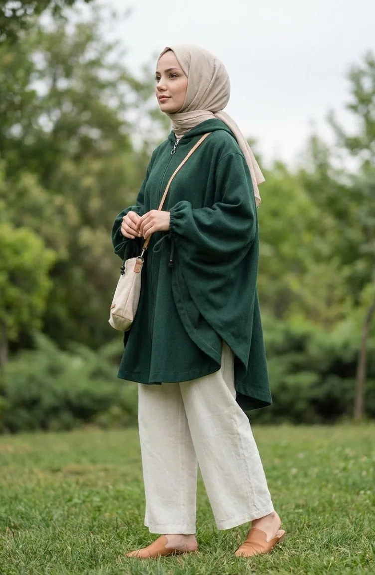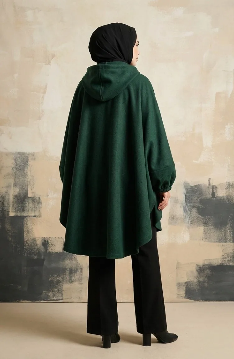Hijab (tesettür) stilinin en asil kışlık parçası: zümrüt yeşili kaşe panço. Pelerin şıklığını kaşe kumaşın sıcaklığıyla birleştiren bu model, modest dress (elbise) ve trikolarınızın üzerine mükemmel bir katmandır. Islamic clothing (İslami giyim) anlayışına uygun bol kesim kalıbı, kapüşonlu modern detayı ve fermuarlı pratik kullanımıyla öne çıkar. Kışlık gardırobunuzun favorisi olacak bu sade panço, büyük beden seçenekleri de sunar.