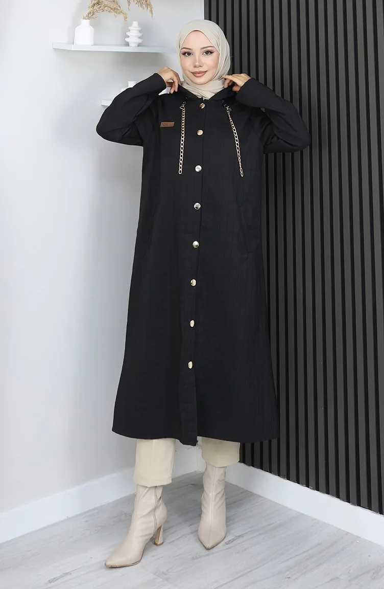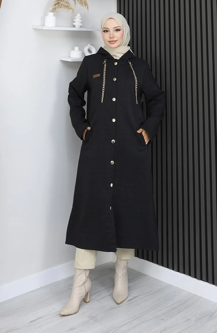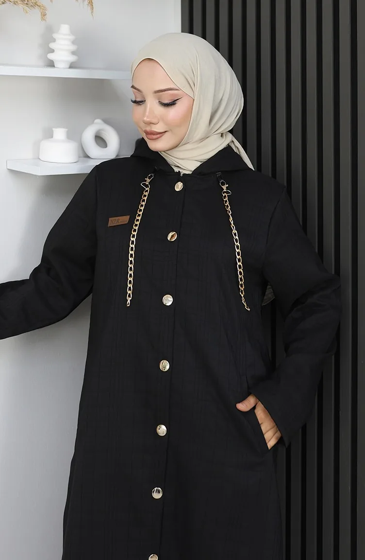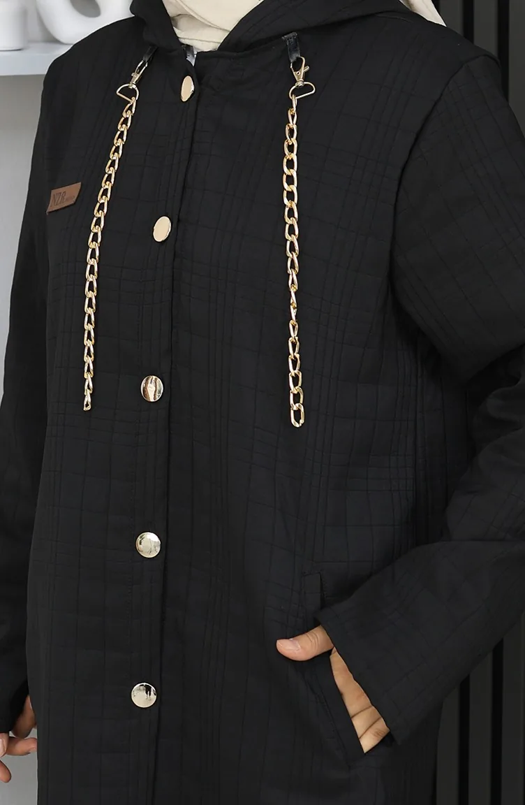 Mevsimlik şıklığın vazgeçilmezi! Siyah rengin asaletini zincir detaylarıyla buluşturan kapüşonlu tesettür kap, günlük ve özel kombinlerinize modern bir dokunuş katacak.