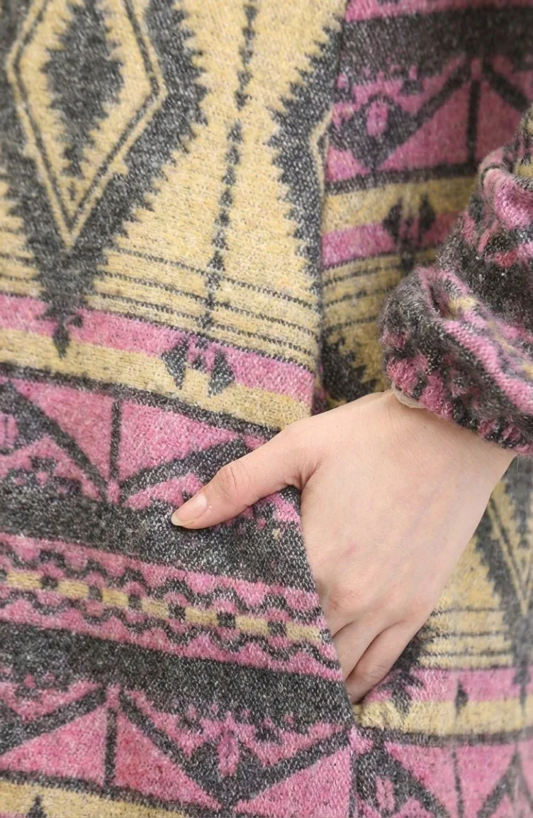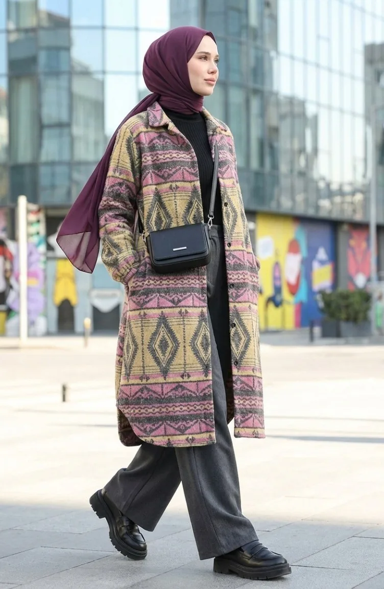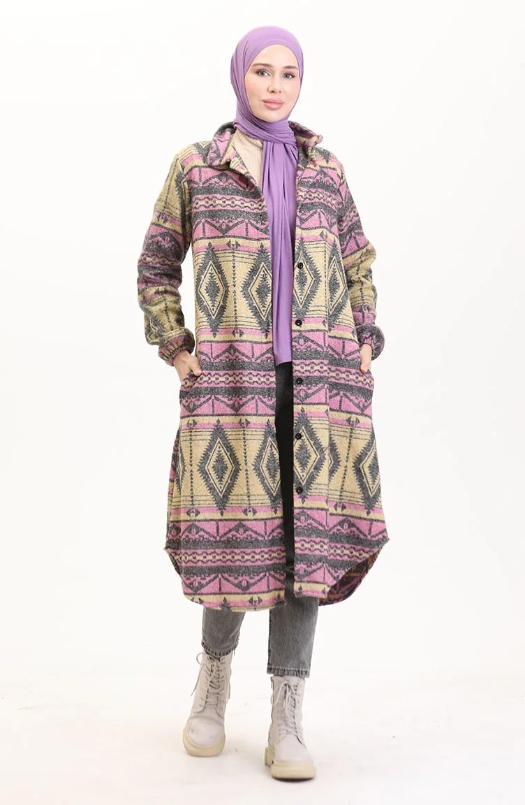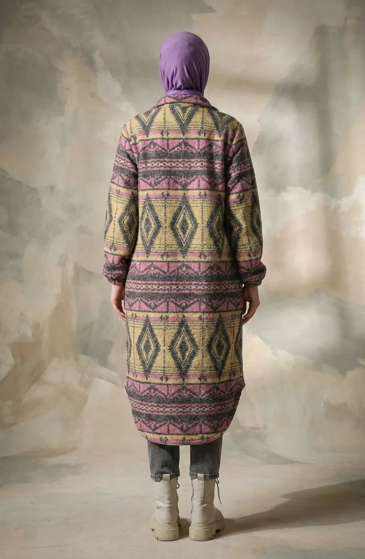 Kış sezonunun ruhunu yansıtan etnik motifler, modern kesimle buluşuyor. Yüksek kaliteli, sıcak tutan dokuma kumaşı sayesinde soğuk havalarda konfor sunar. Önden boydan düğmeli tasarımı kullanım kolaylığı sağlarken, dik yakası rüzgara karşı koruma sağlar. Hem pantolon hem de etek kombinlerinizle uyum sağlayan bu kap, gardırobunuzun en şık dış giyim parçası olmaya aday.