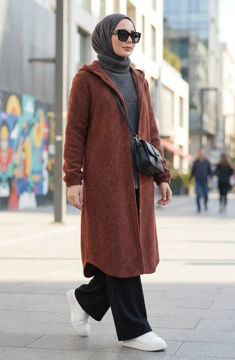 Yeni sezonun en dikkat çeken dış giyim parçalarından biri olan bu kap, modern tesettür giyim standartlarını konforla birleştiriyor. Kış ve sonbahar aylarının sert hava koşullarına karşı koruma sağlayan yoğun dokulu kumaşı, gün boyu sıcak kalmanıza yardımcı olur. Kendinden dokulu yüzeyi, ürüne derinlik katarak sıradan bir dış giyim parçasından daha fazlasını sunar.Kumaş Özelliği: Yüksek kaliteli, nefes alabilen ve ısıyı hapseden özel dokuma kumaştan üretilmiştir.Tasarım Detayları: Pratik kullanım sağlayan sabit kapüşon yapısı, ön boydan düğme kapama ve bilekleri kavrayan elastik manşet detayları ile tasarlanmıştır.Kalıp ve Kesim: Rahat kesimi sayesinde farklı vücut tiplerine uyum sağlar, hareket özgürlüğünü kısıtlamaz.Kombin Önerisi: Jean pantolonlar ve deri botlarla spor bir görünüm yakalayabileceğiniz gibi, kumaş pantolon ve şallarla daha klasik bir silüet oluşturabilirsiniz.Modern çizgileri ve zamansız tasarımıyla muhafazakar stilinize güç katan bu model, gardırobunuzun en işlevsel parçası olmaya aday. İç göstermeyen yapısı ve ideal boyu ile her ortamda güvenle tercih edilebilir.