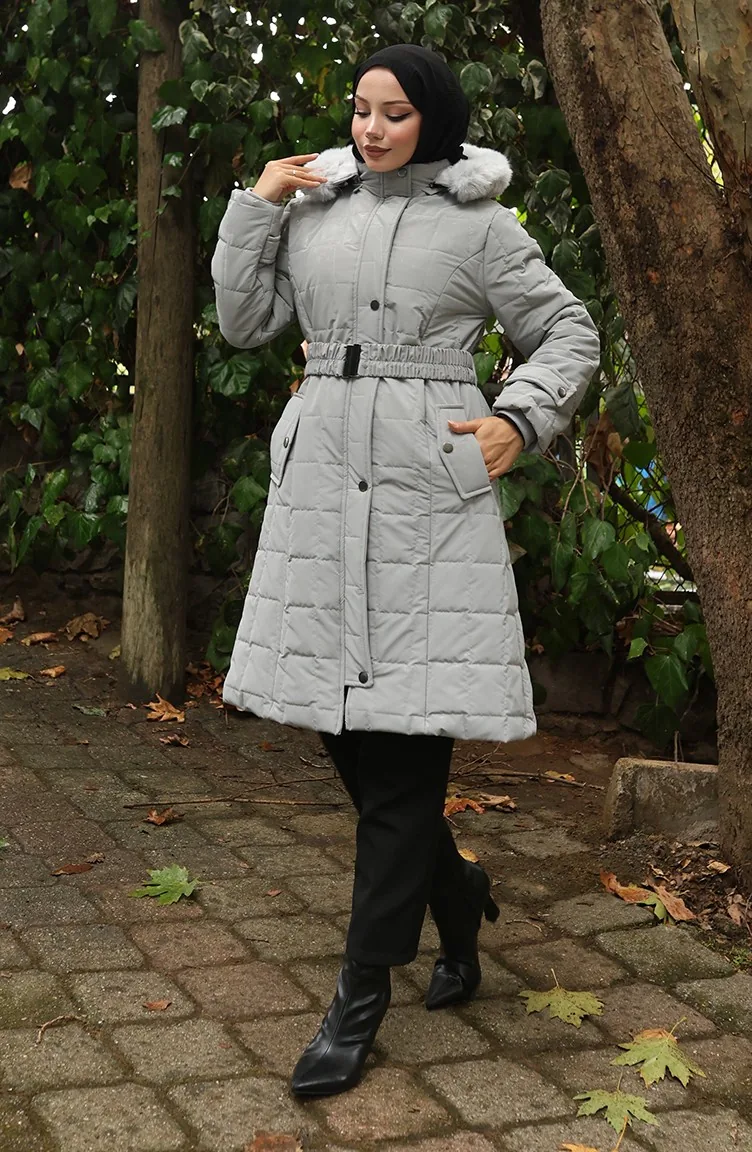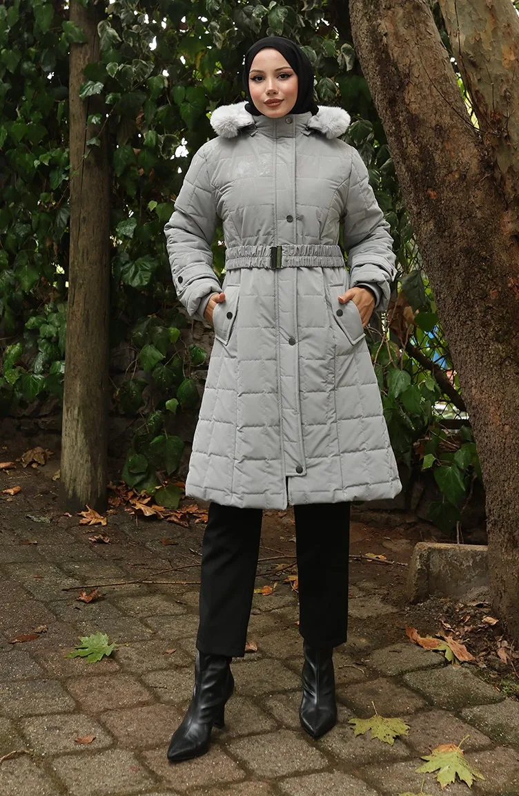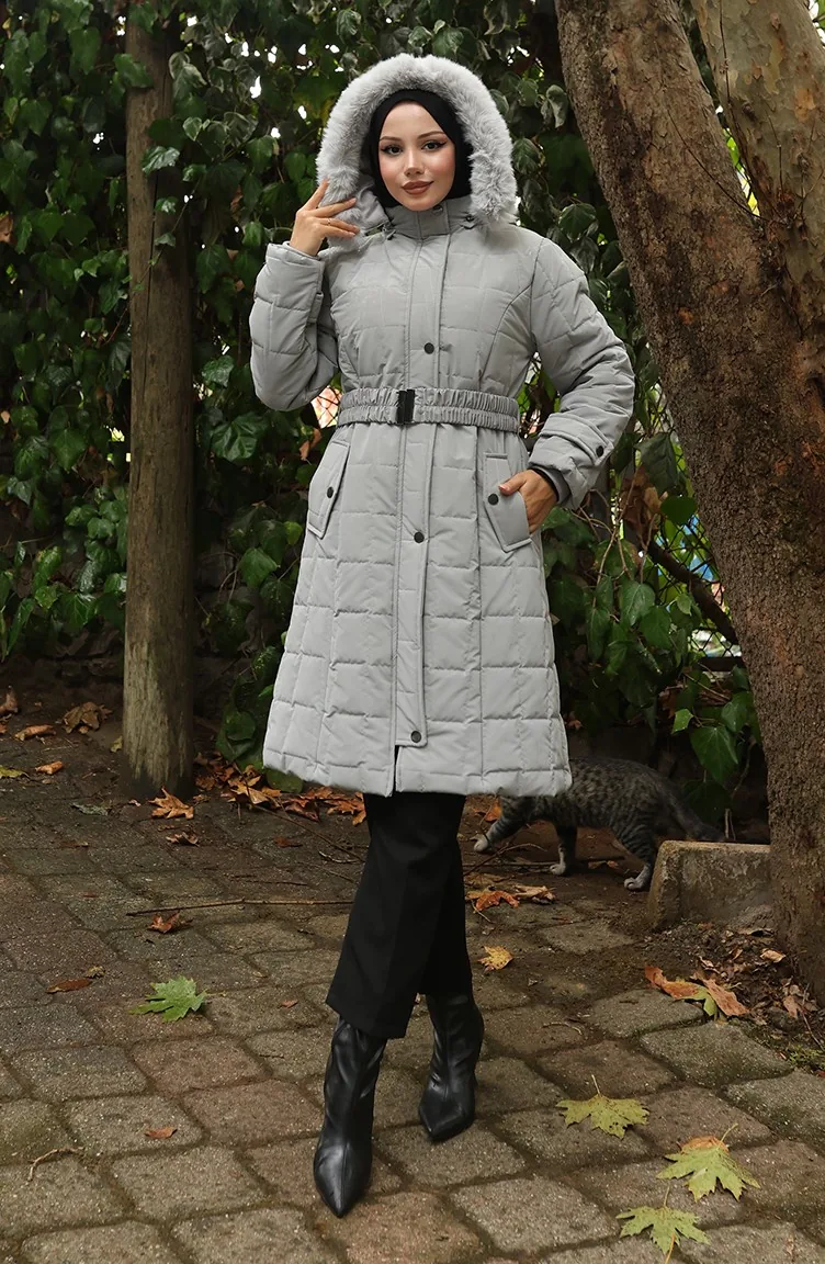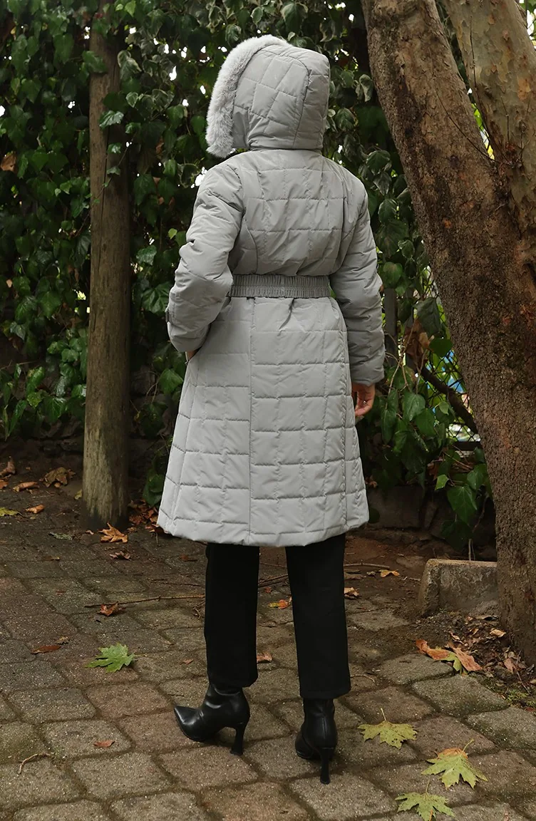 Kürk Kapüşonlu Kemerli Kapitone Mont 6307-03 Gri