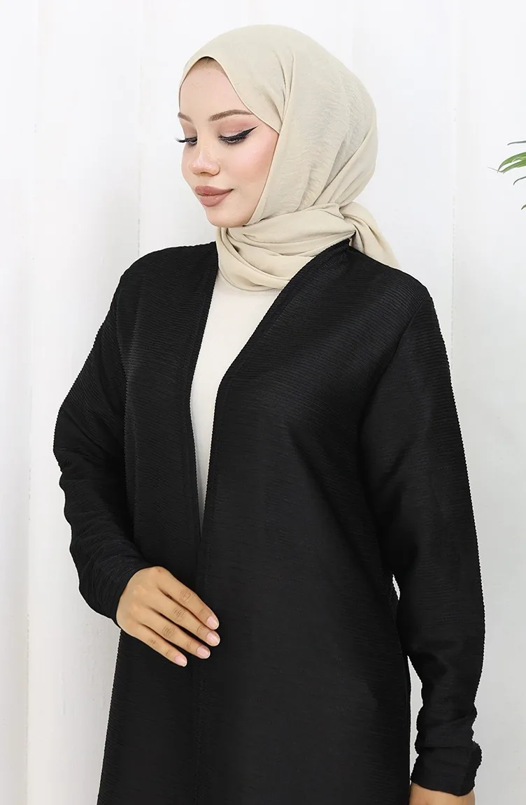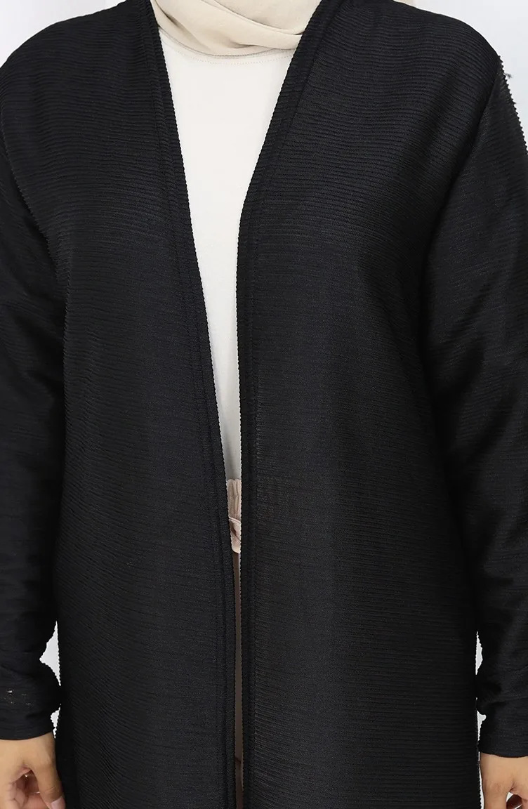 Black color is used. Knitted fabric is used. It has a plain appearance. Plus size option available.