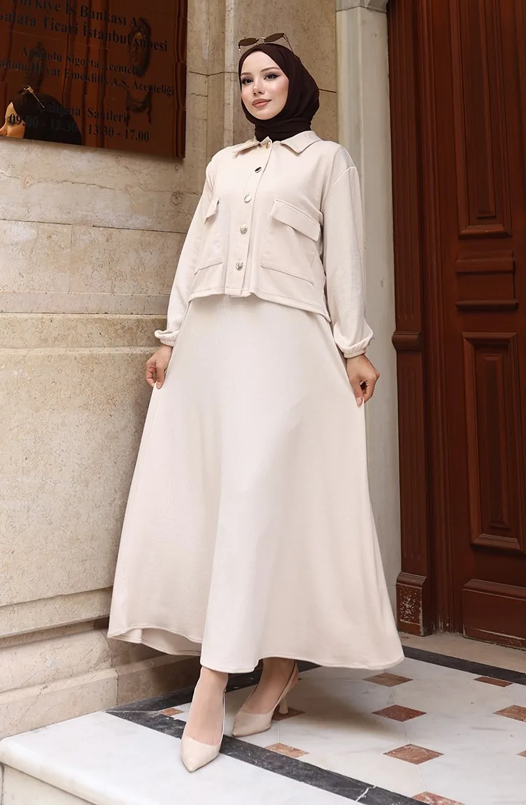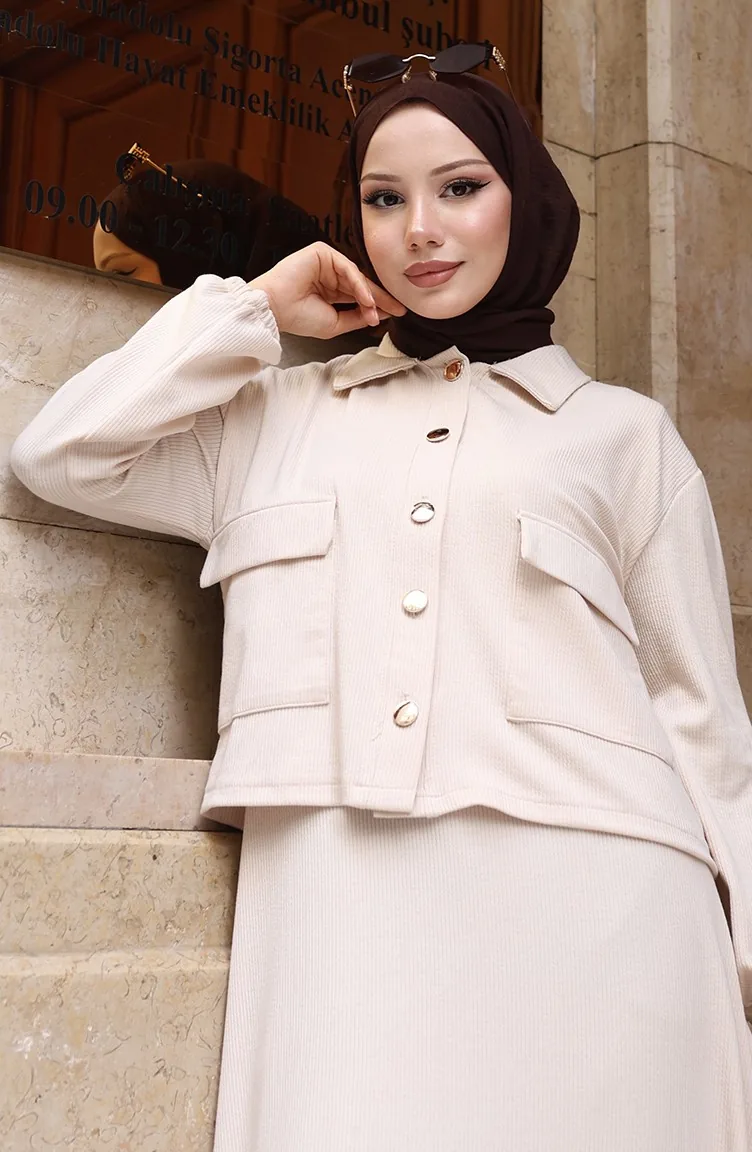 Corduroy Geknoopt Jasje Jurk Hijab Pak 0219-07 Beige 0219-07