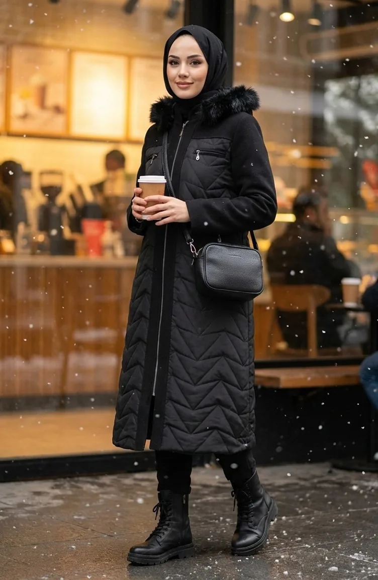 Black color is used. It is cachet fabric, you can use it easily in winter. It has a plain appearance. Since the fabric thickness of the model is in the middle level, the liner is used. Designed from thick fabric. Plus size option available.