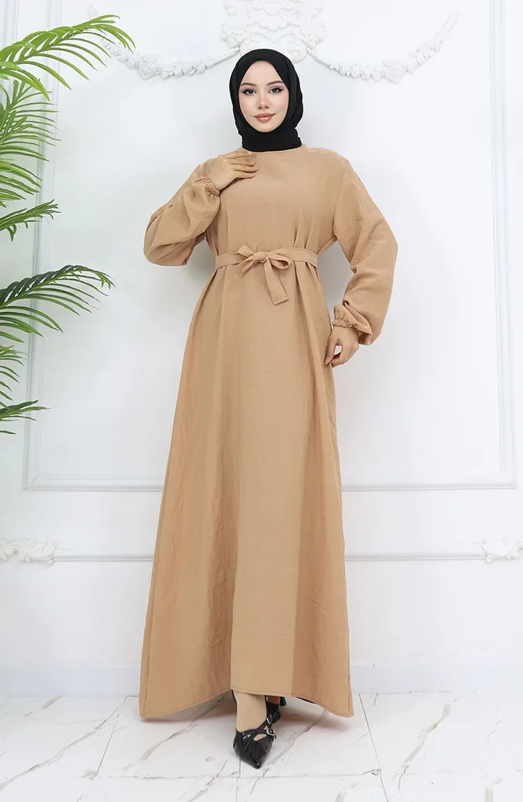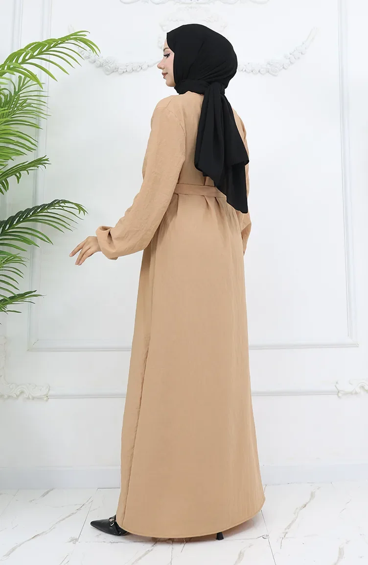The camel color is used. Aerobin. It has a plain appearance. It's made of elastic sleeves. The Zero collar is preferred for all types of clothing. Suitable for 4 seasons. Rahat. Plus size option available.