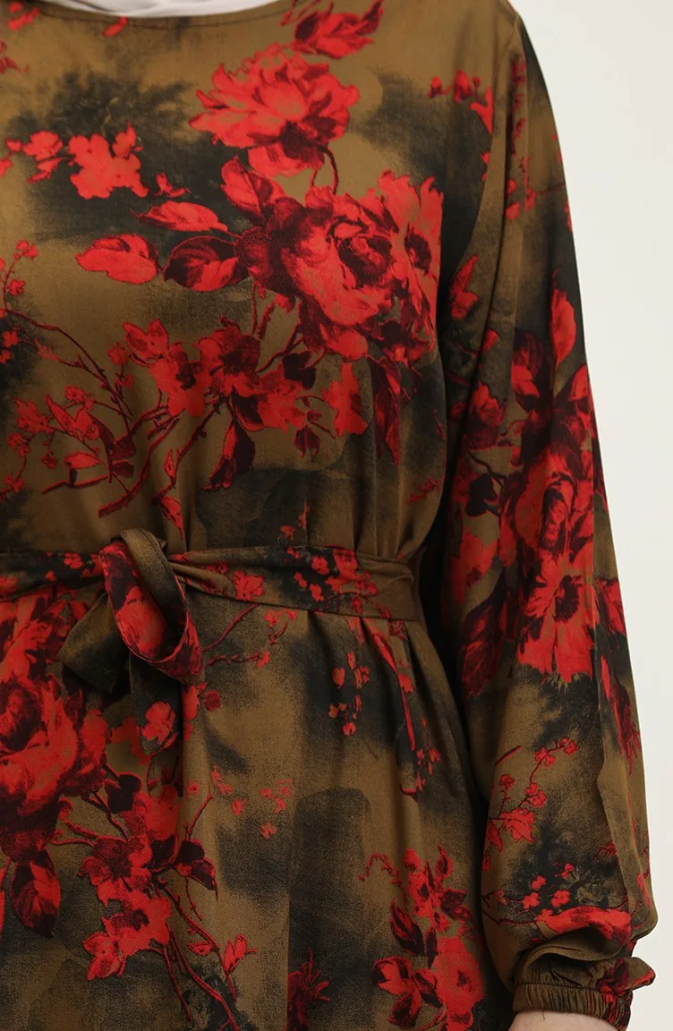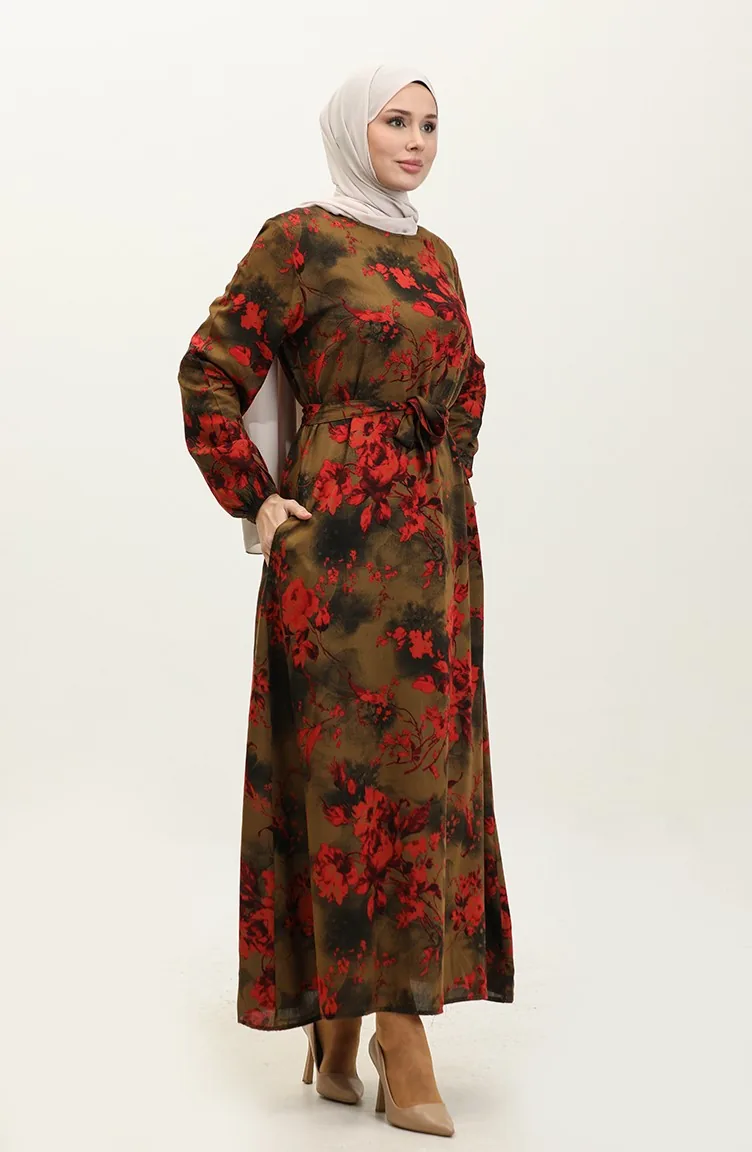 Ahsen Viscose-jurk Met Bloemenpatroon 0329-01 Hennagroen Rood 0329-01