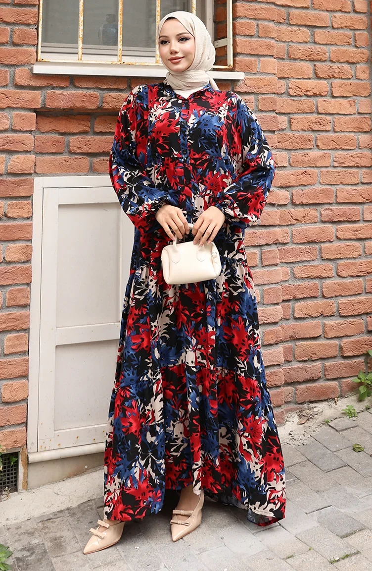 Alaçatı Patroon Geknoopte Jurk 2021-06 Indigo Rood 2021-06