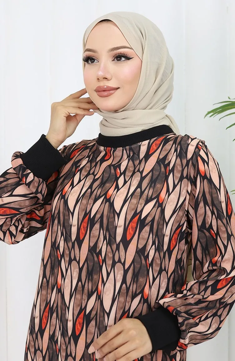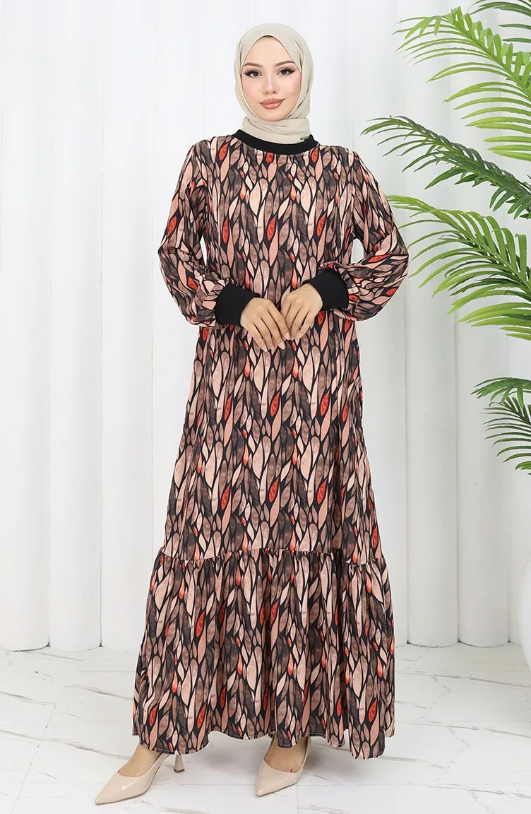 Chiffon Stof Bladmotief Jurk 0054-03 Zwart 0054-03