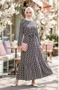 Digitaal Bedrukte Geplooide Jurk Met Riem 1006A-01 Zwart-wit 1006A-01