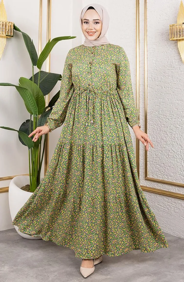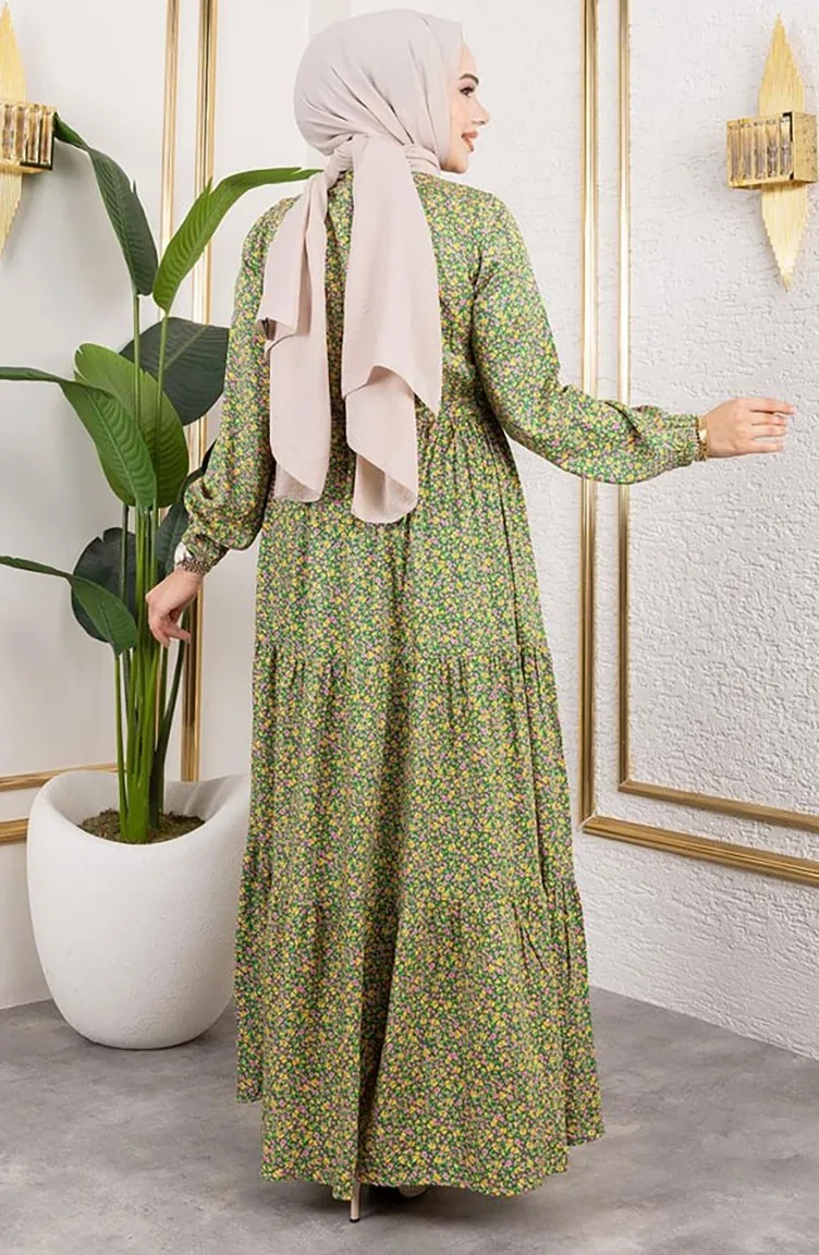 Efsun Bloemenpatroon Jurk 7136-06 Groen 7136-06