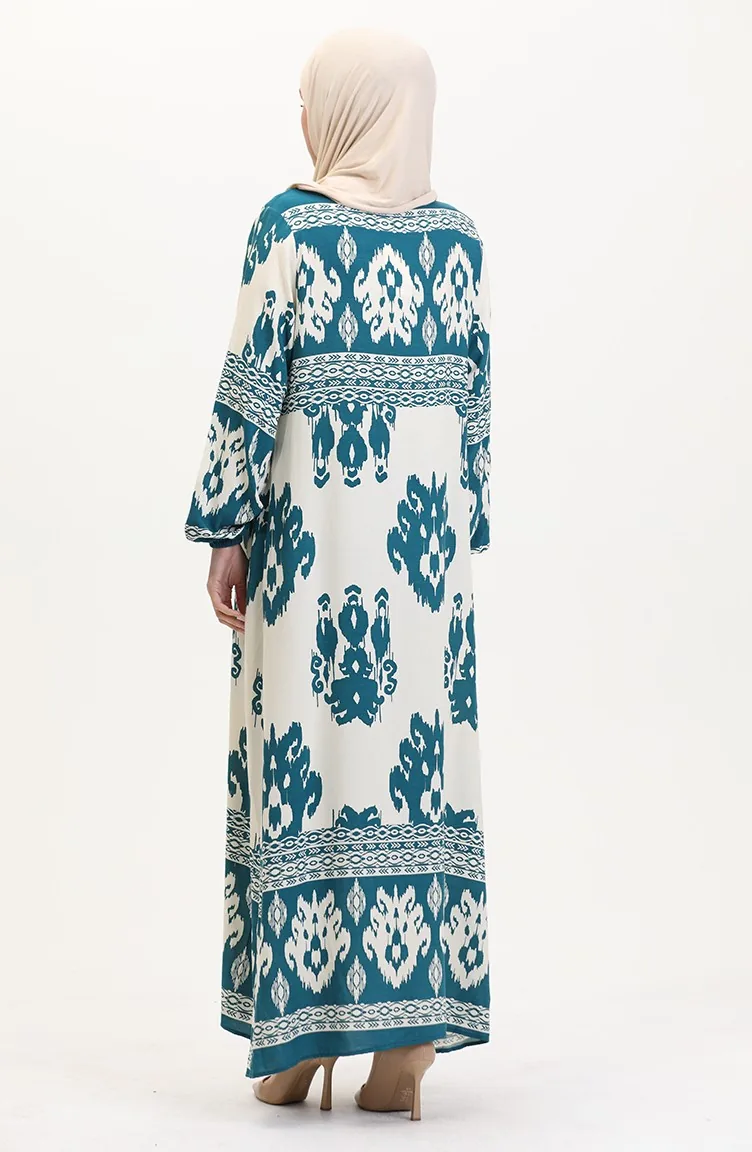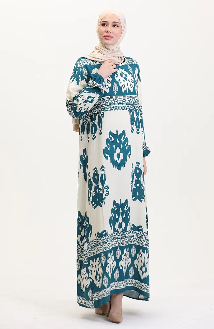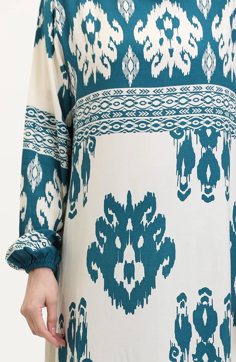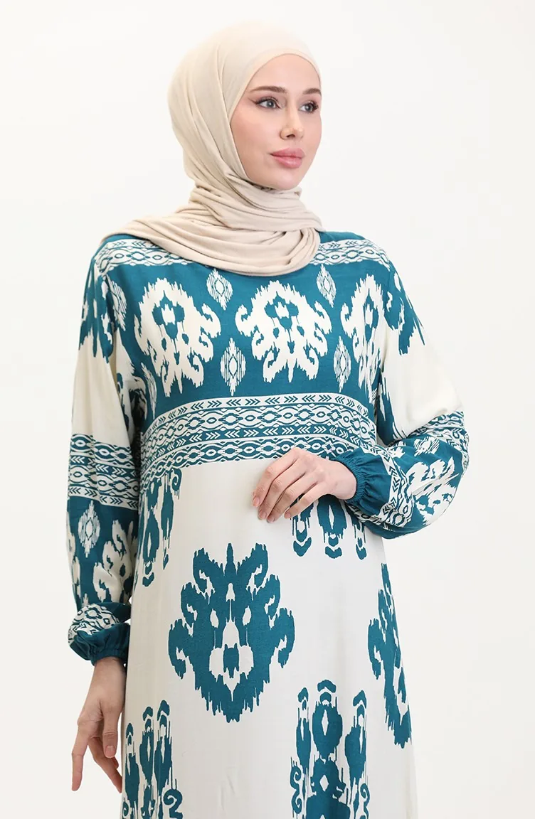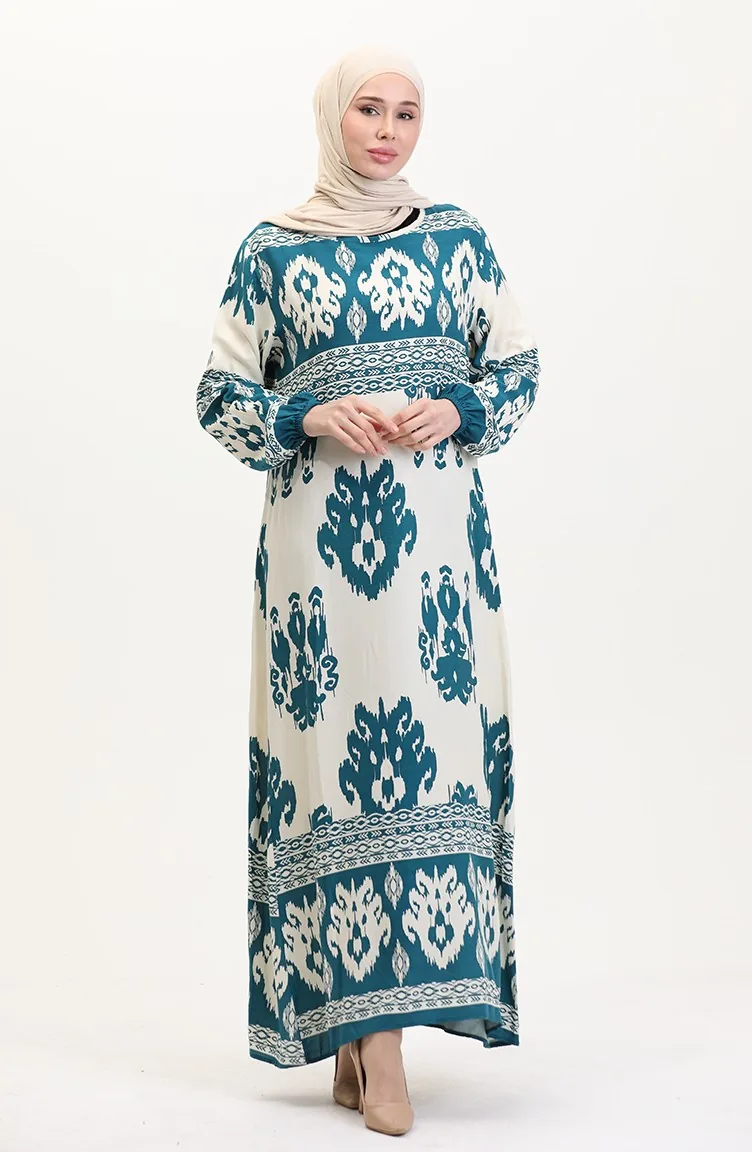 Gedessineerde Viscosejurk 0006-03 Petrol Beige 0006-03