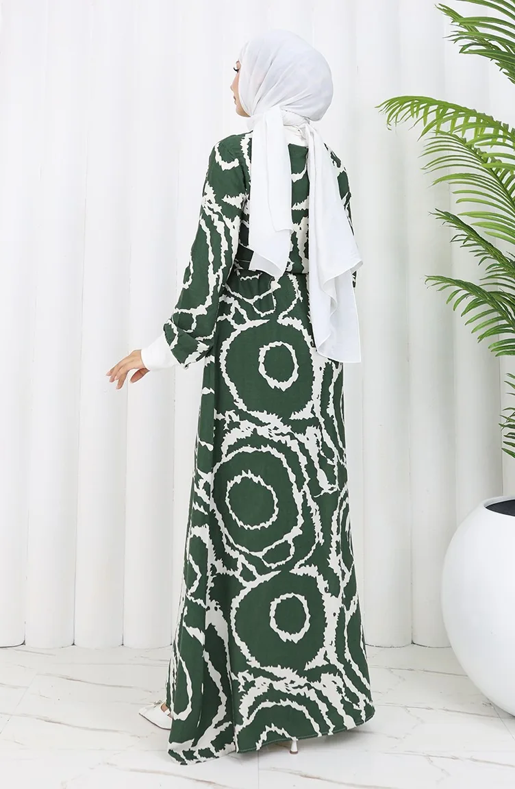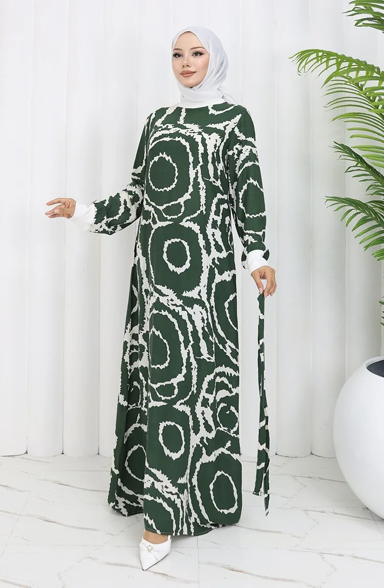 Geribbelde Gedetailleerde Viscosejurk Met Riem 0447-03 Kaki Wit 0447-03