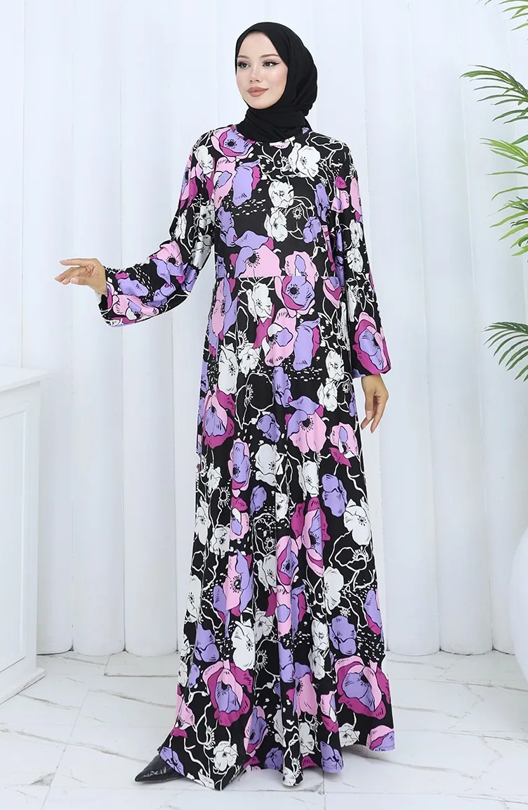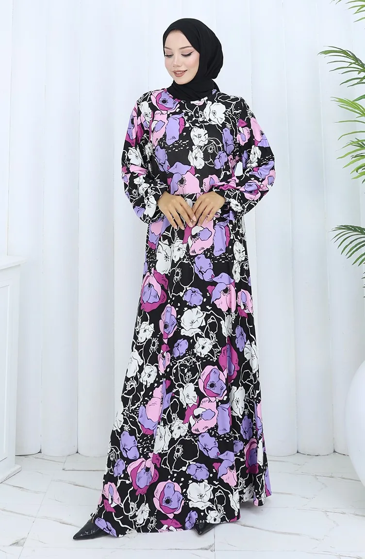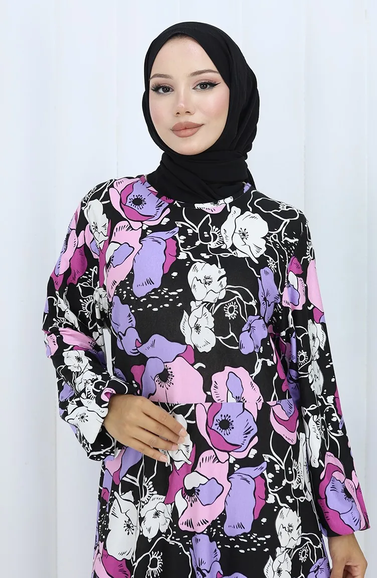 Gestreepte Gekamde Katoenen Jurk 2135B-01 Zwart/paars 2135B-01