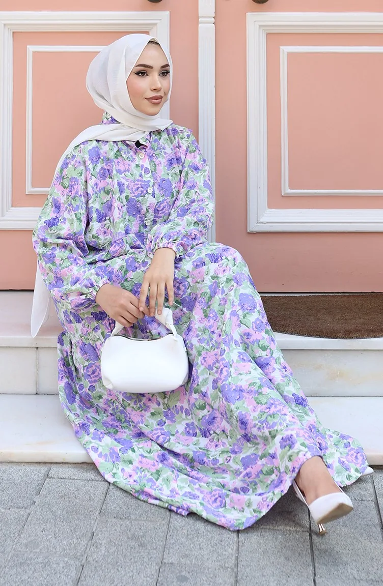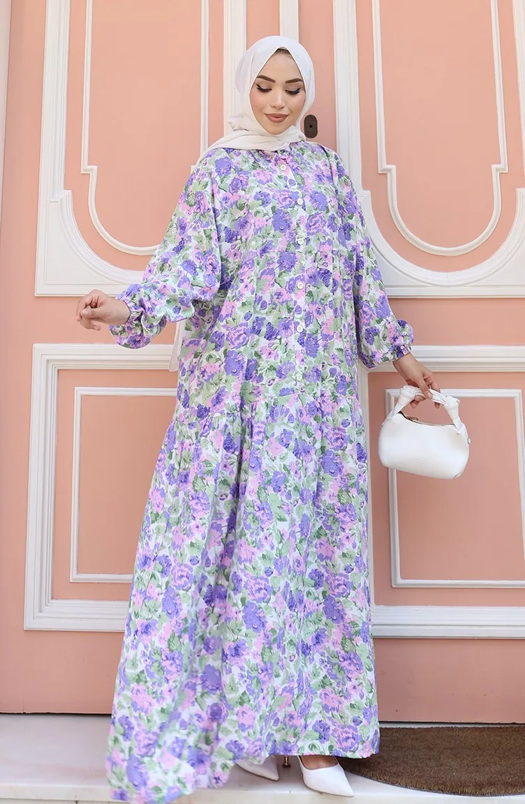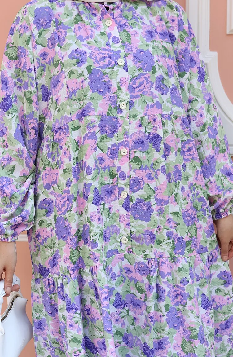 Lilac color is used. The cotton fabric has an absorbent texture. Designed with patterned fabric. Buttons have been used to make it easy to use. It's made of elastic sleeves. Tippet collar is prefered. Suitable for 4 seasons. Plus size option available.