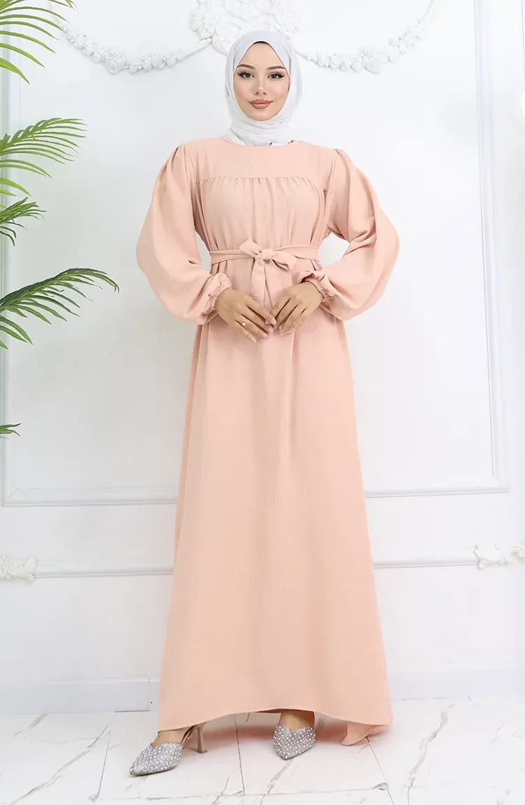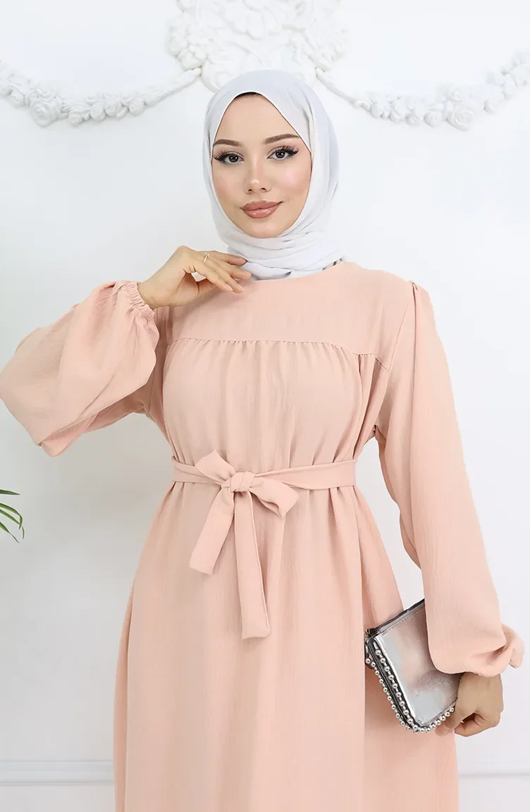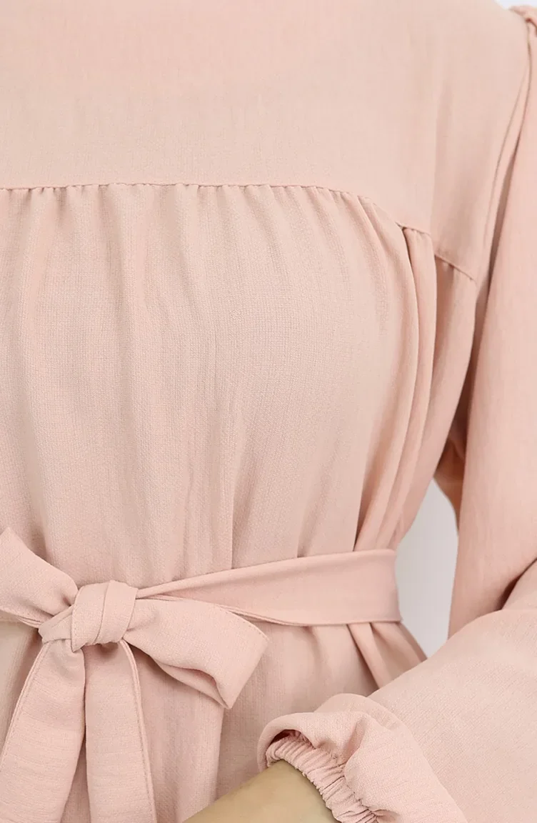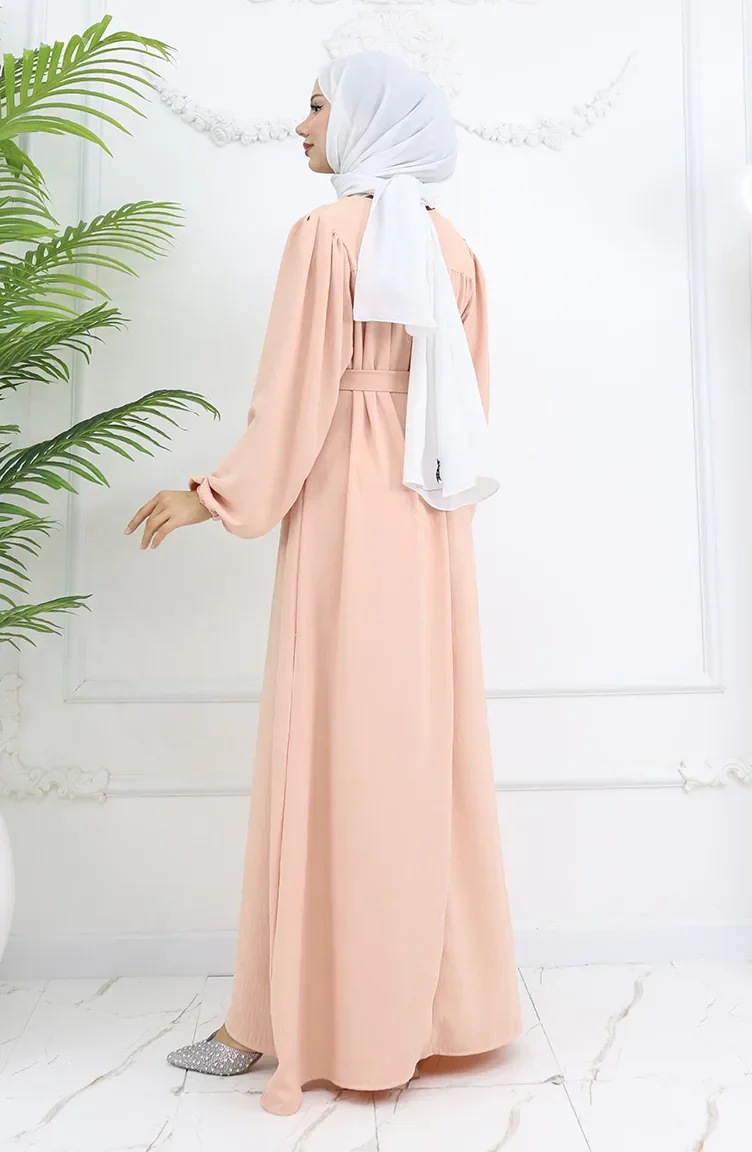 Salmon color is used. It has a plain appearance. The belt provides ease of use depending on the demand. It's made of elastic sleeves. The Zero collar is preferred for all types of clothing. Suitable for 4 seasons. Rahat. Plus size option available.