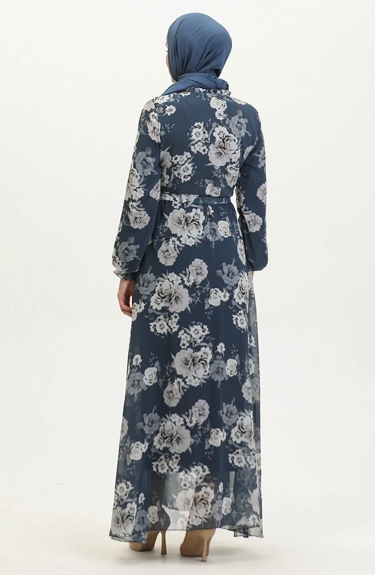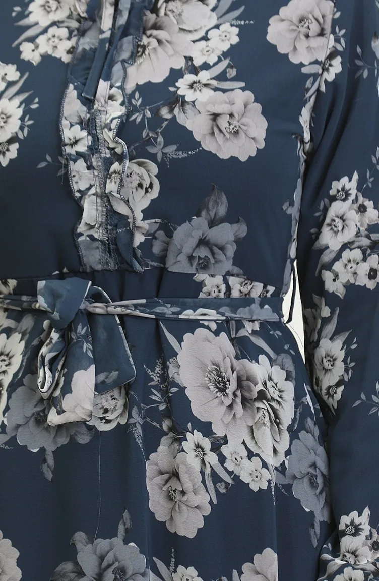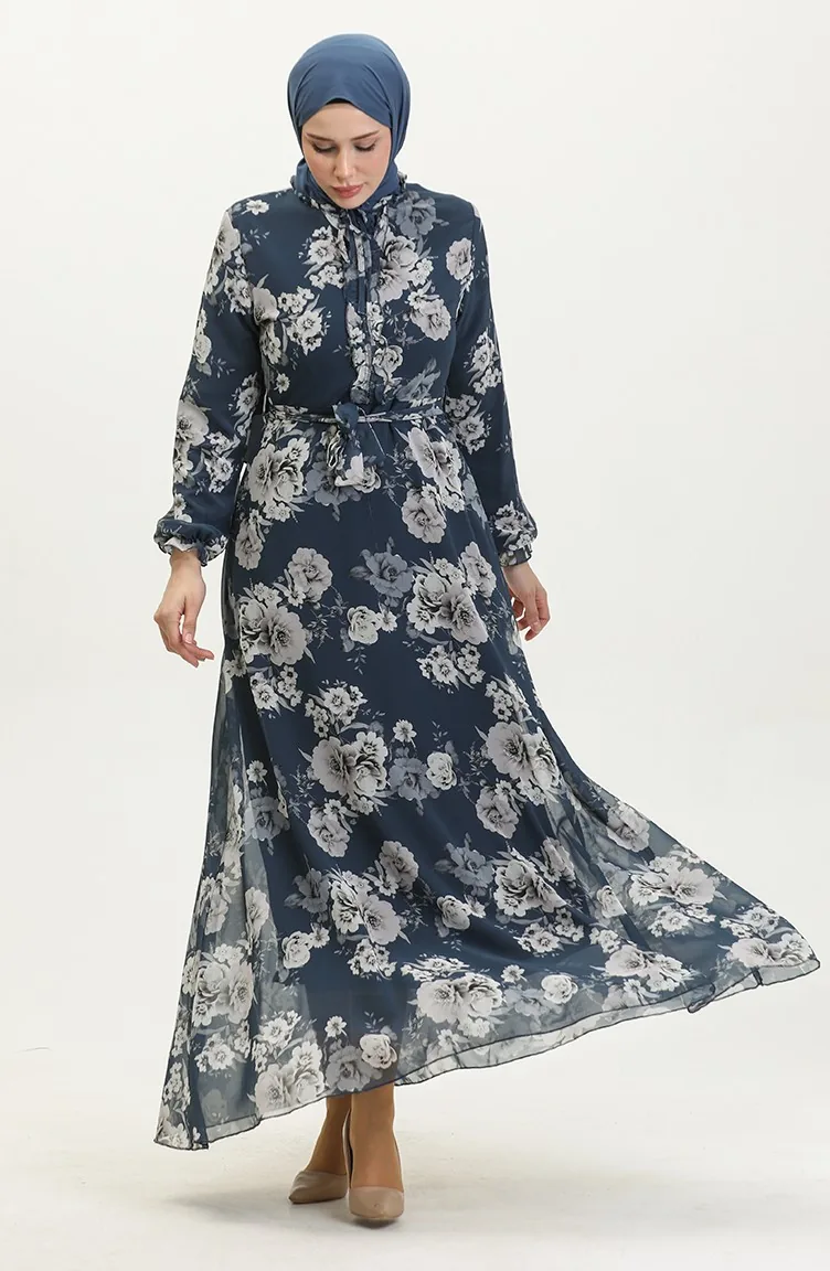 Jurk Van Chiffon Met Rozenmotief En Riem 81832-04 Marineblauw 81832-04
