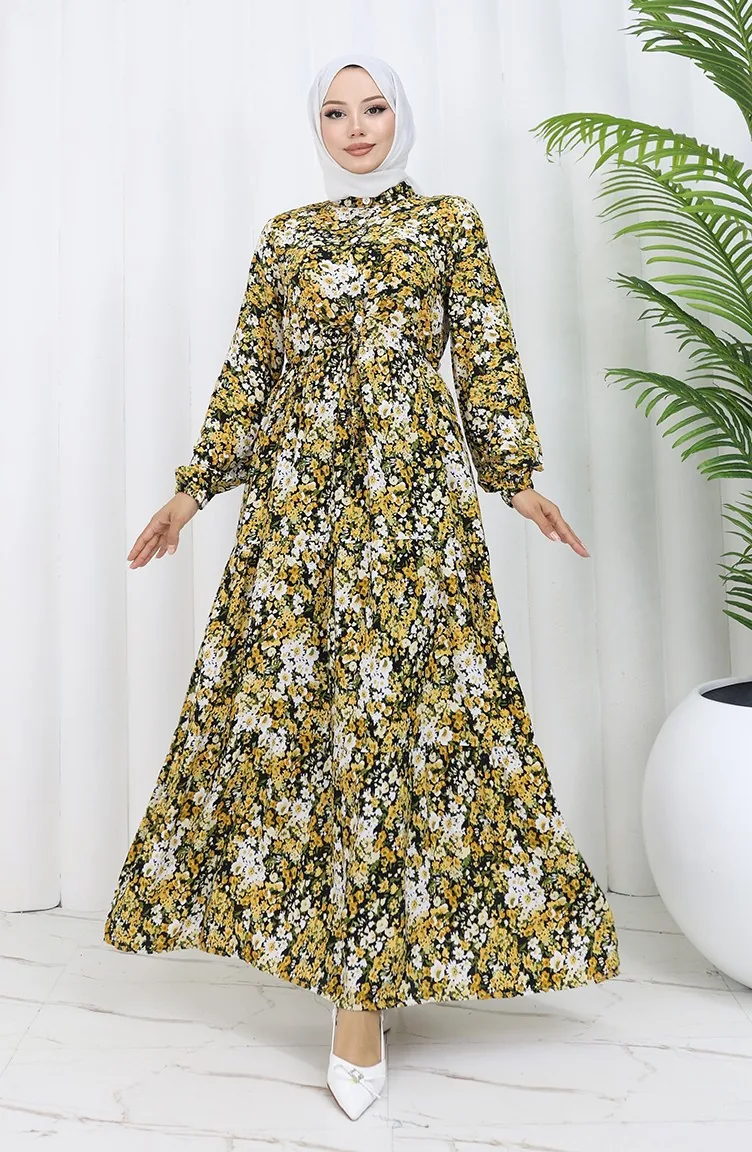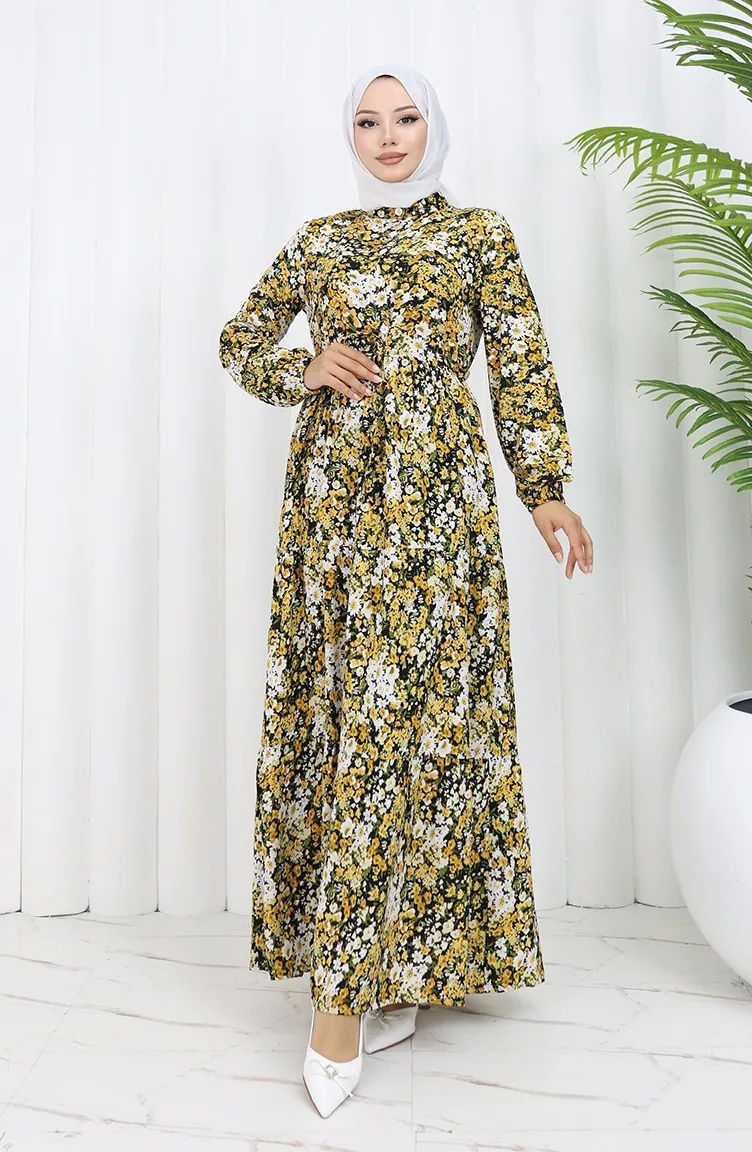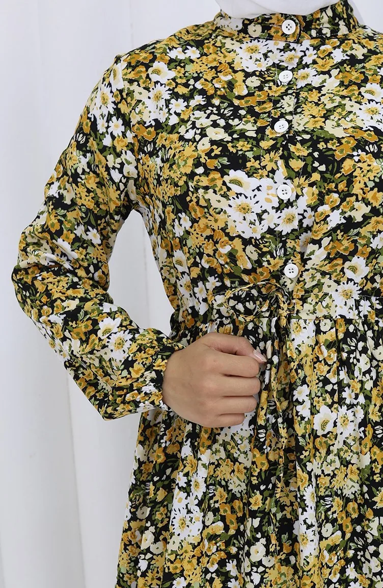 Lente-jurk Met Halve Knopen En Bloemenmotief 0361-05 Geel 0361-05