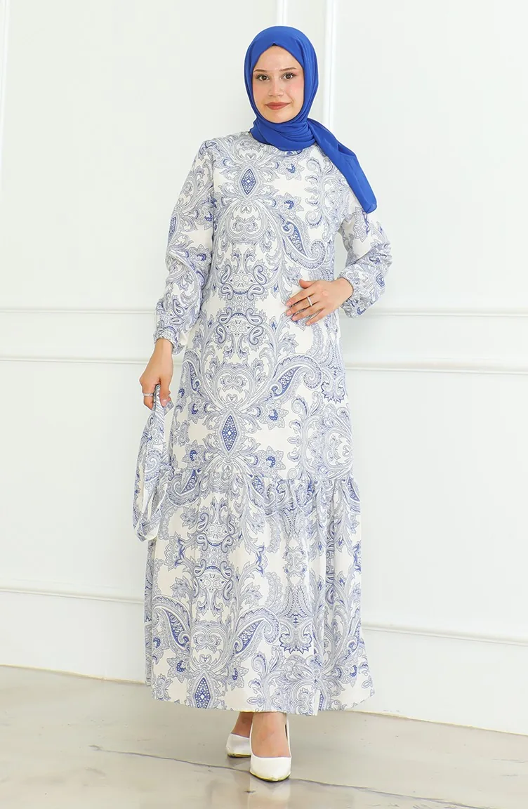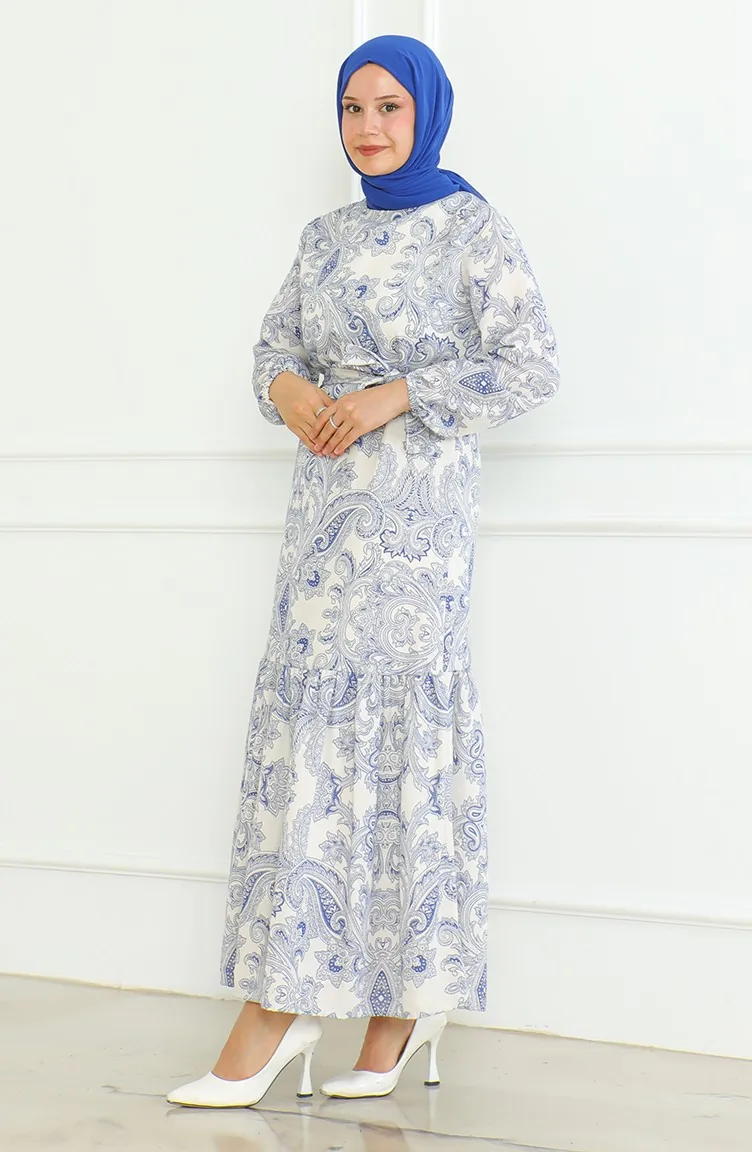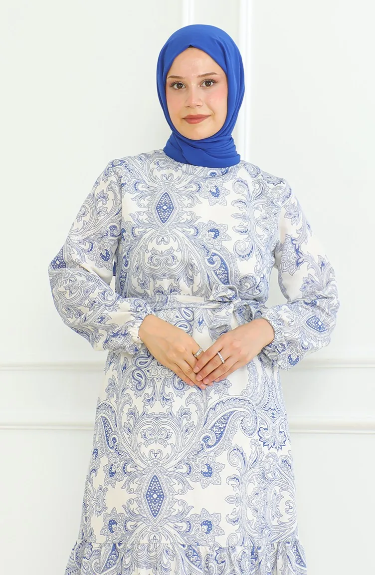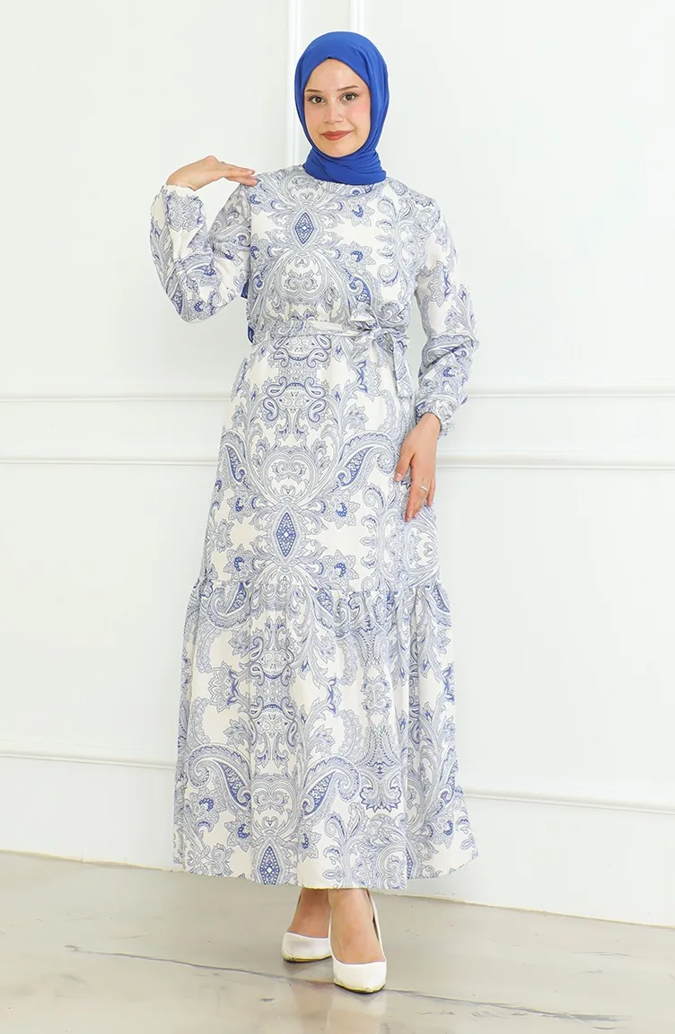 Saxon blue color is used. The linen fabric is resistant to heat and available in all seasons. Designed with patterned fabric. The belt provides ease of use depending on the demand. It's made of elastic sleeves. The Zero collar is preferred for all types of clothing. Suitable for 4 seasons. Plus size option available.