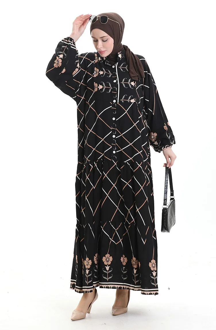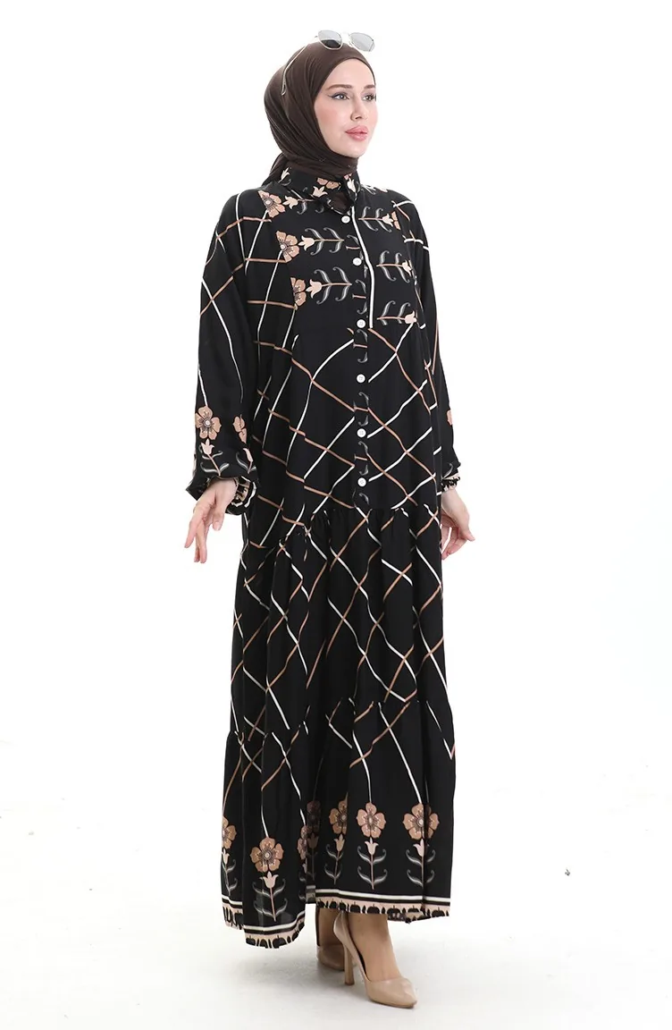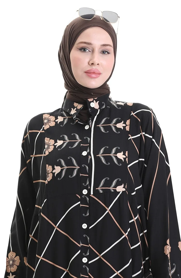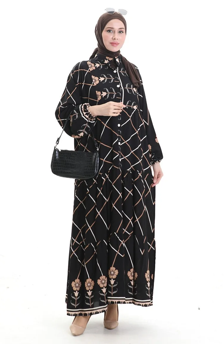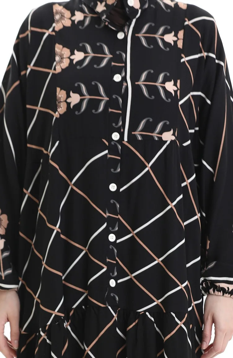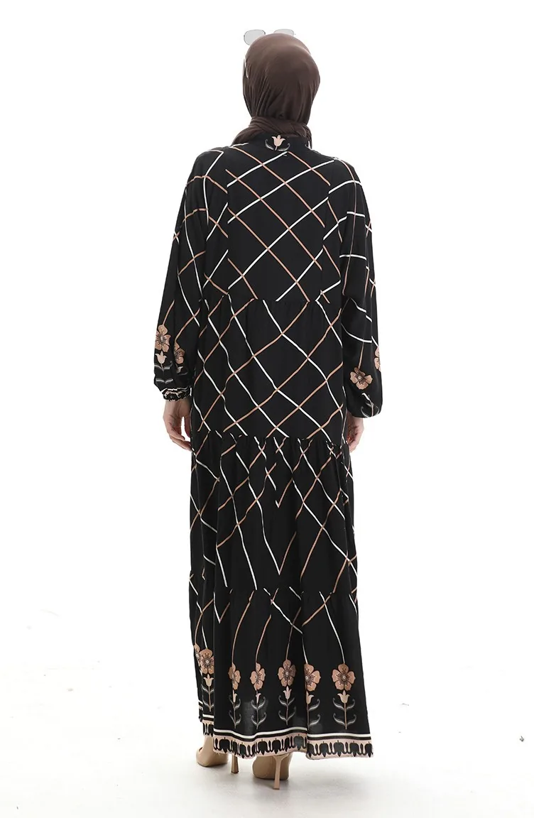 Rechterkraagjurk Met Patroon 2075-03 Zwart Melkkoffie 2075-03