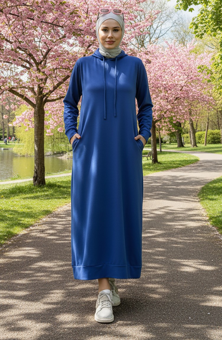 Saxon blue color is used. The cotton fabric has an absorbent texture. It has a plain appearance. It's a hooded product. Spor. Plus size option available.