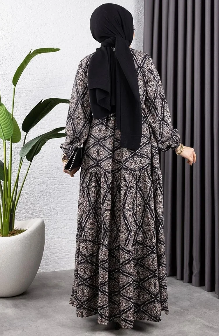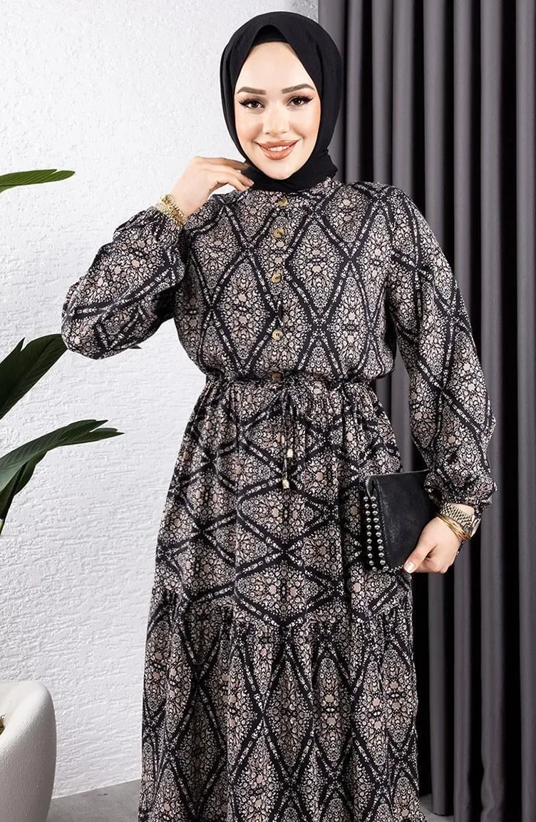 Black color is used. Viscose is a type of synthetic fabric and is convenient to use. Designed with patterned fabric. Buttons have been used to make it easy to use. Tippet collar is prefered. Suitable for 4 seasons. The size worn by the model, is the one on the image.