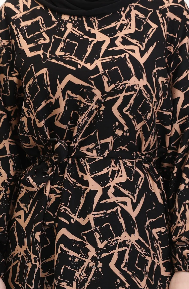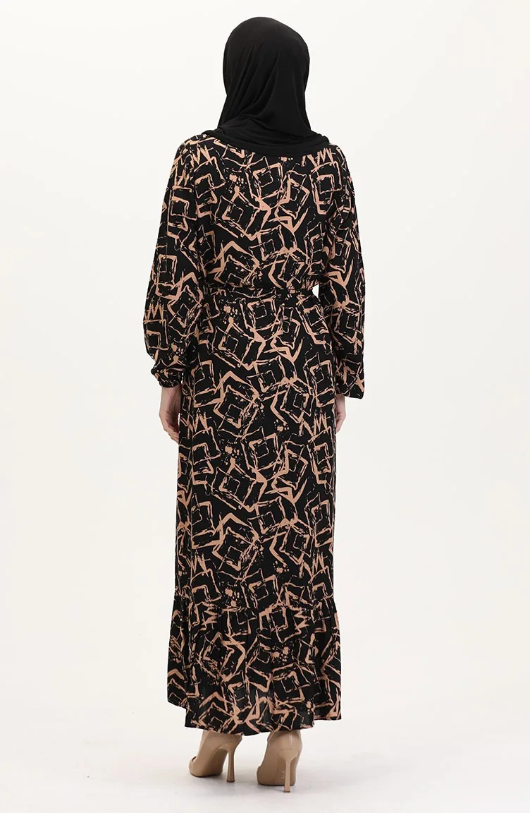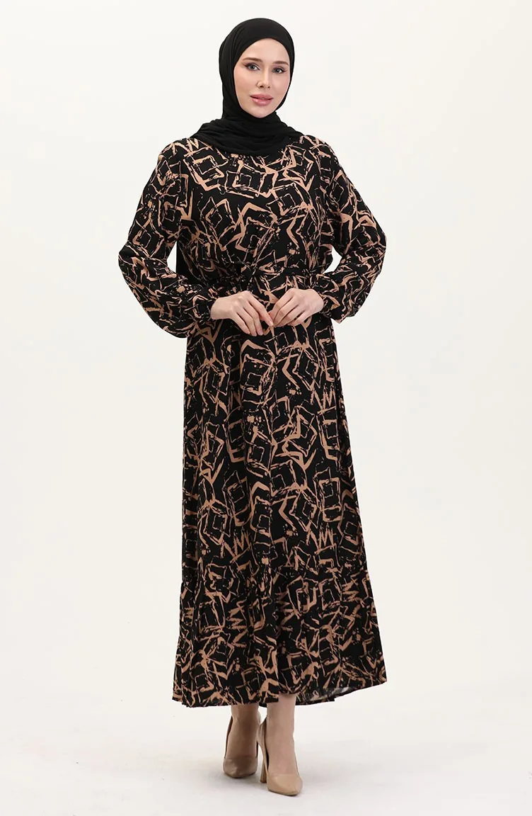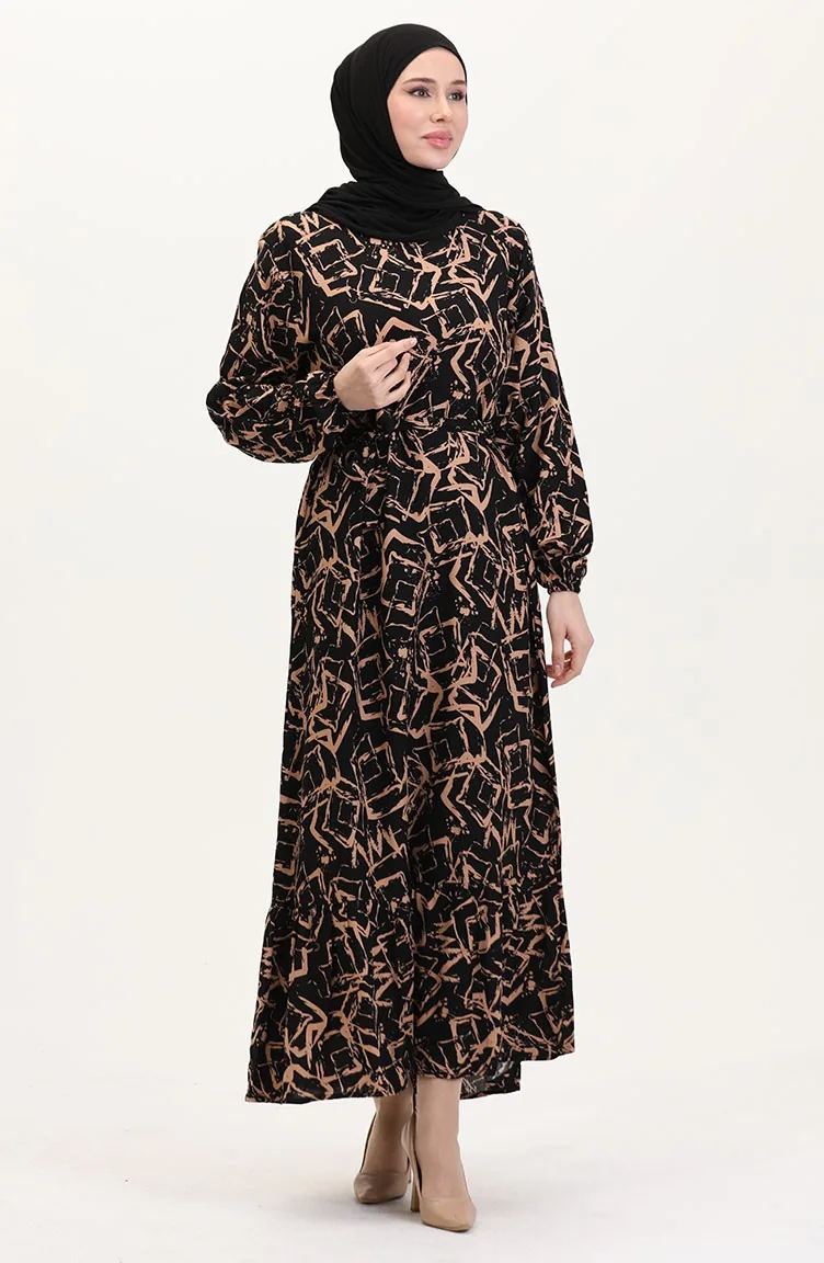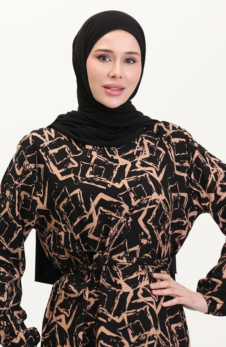 Viscose Jurk Met Patroon En Riem 0011-02 Black Milk Coffee 0011-02