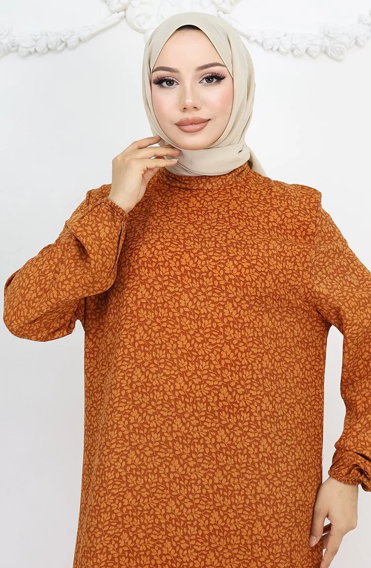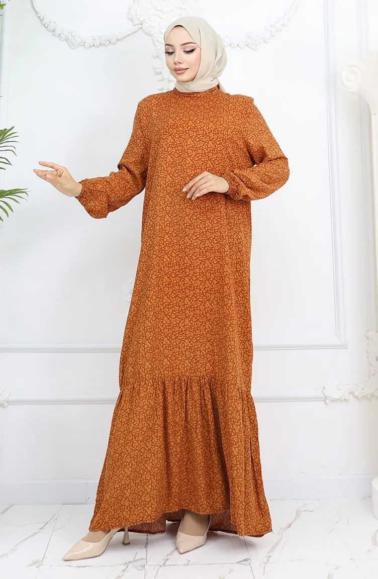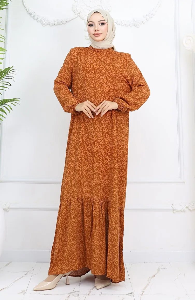 Viscose Stof Elastische Mouw Patroon Jurk 2015-02 Bruin 2015-02