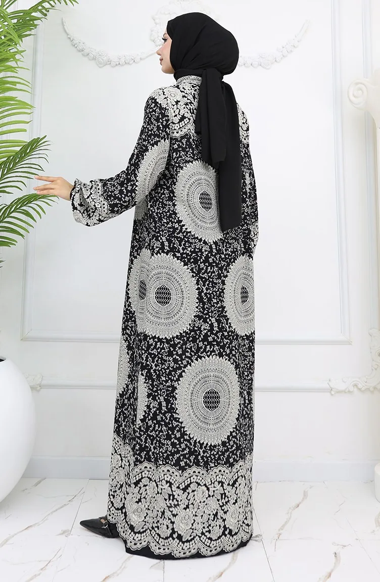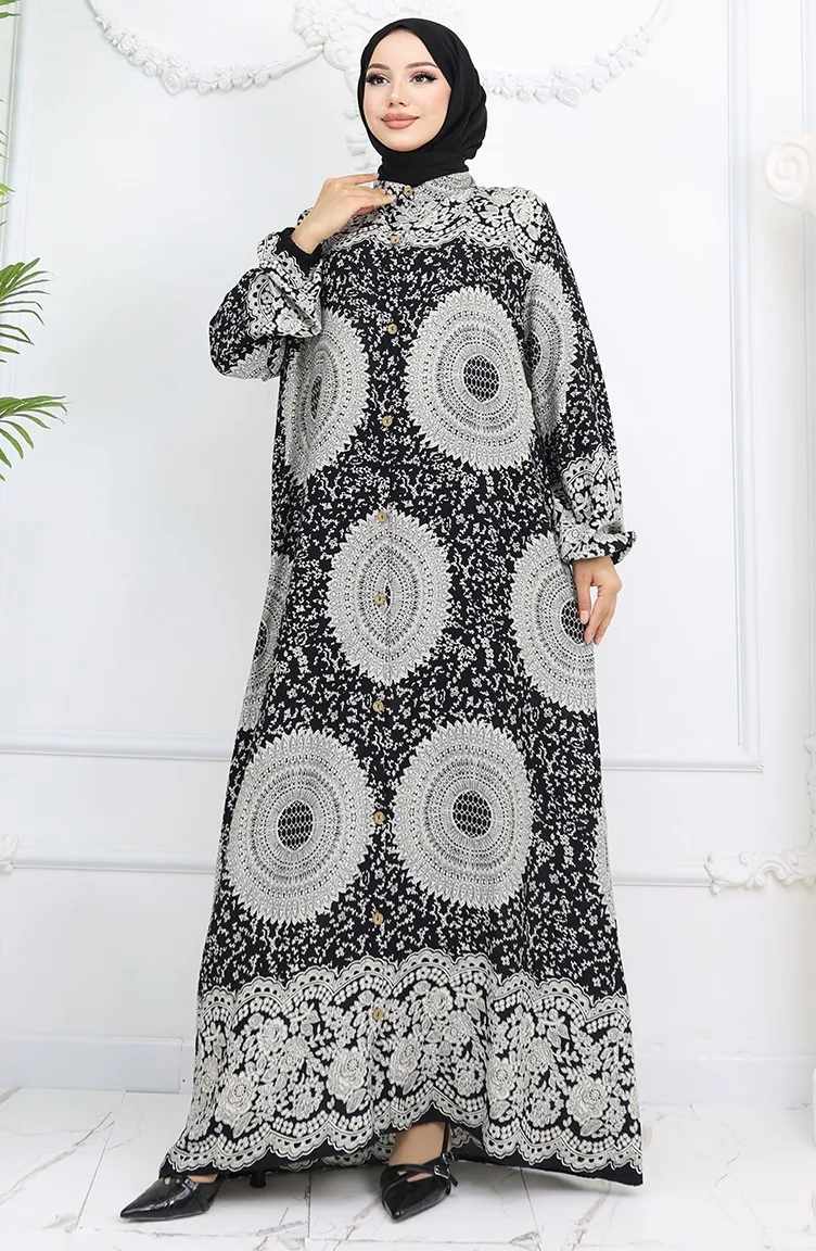 Black color is used. Viscose is a type of synthetic fabric and is convenient to use. Designed with patterned fabric. The product is used unlined. It's made of elastic sleeves. Tippet collar is prefered. Suitable for 4 seasons. Rahat. Plus size option available.
