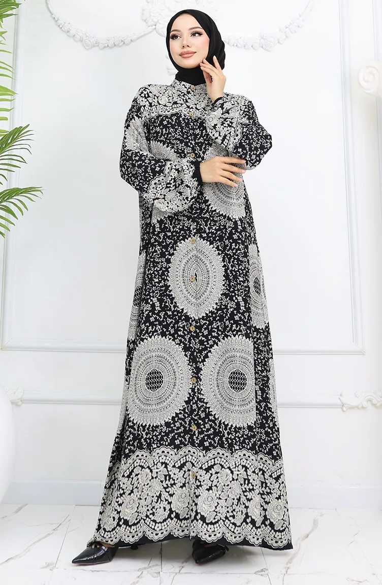 Viscose Stof Geknoopte Jurk Met Patroon 0047-01 Zwart 0047-01