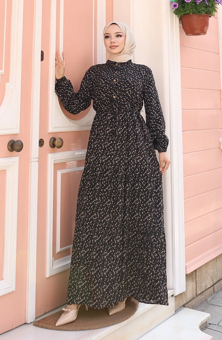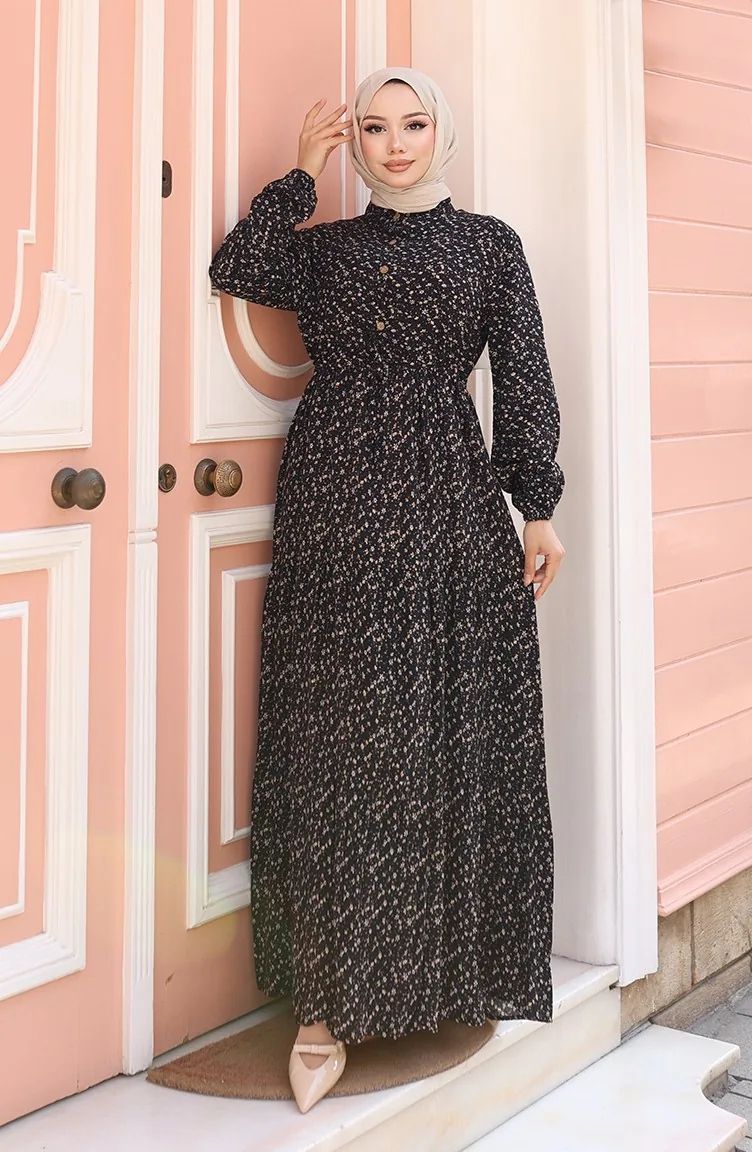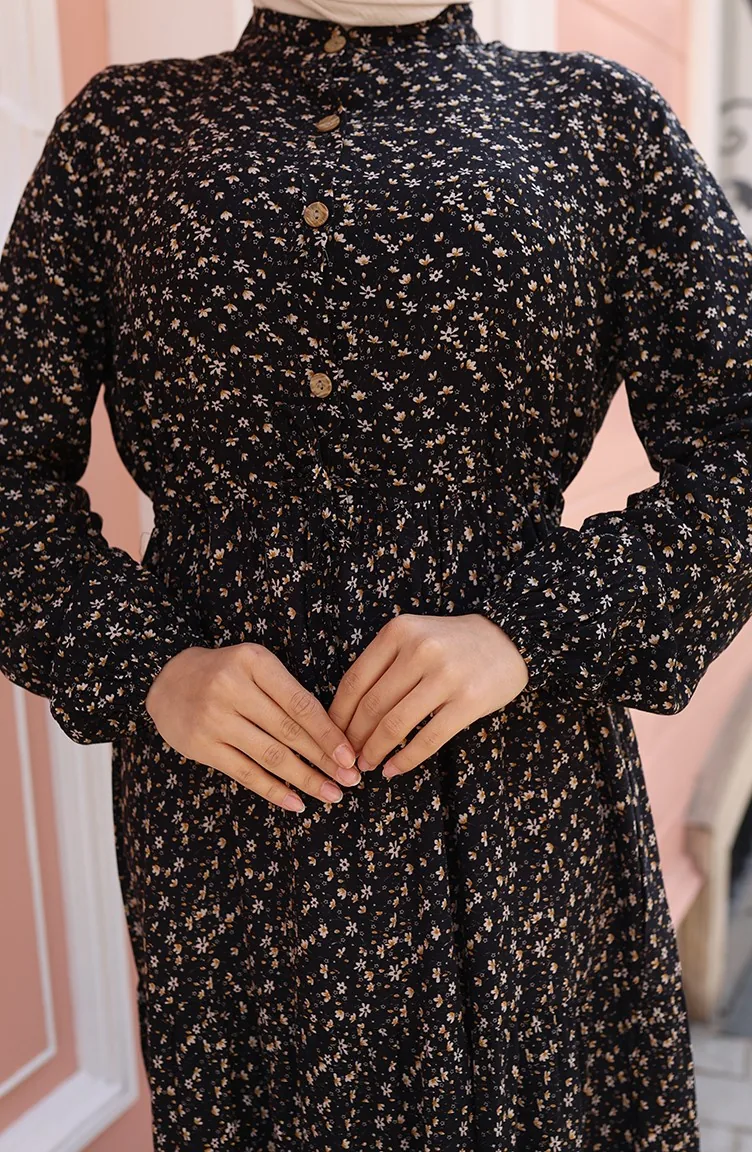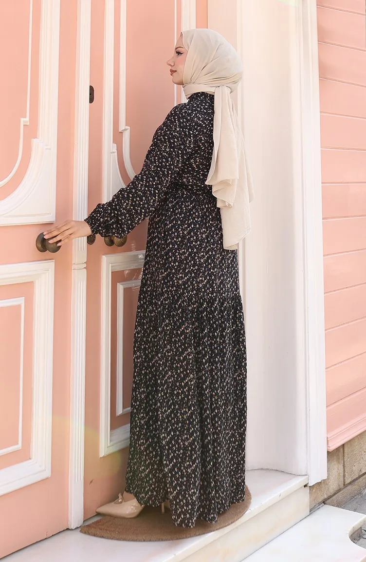 Viscose Stof Half Geknoopte Jurk Met Patroon 0043-02 Zwart 0043-02