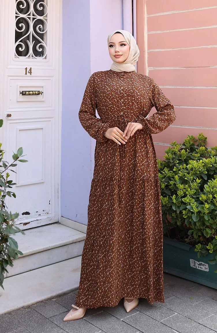Viscose Stof Half Geknoopte Jurk Met Patroon 0043-04 Bruin 0043-04