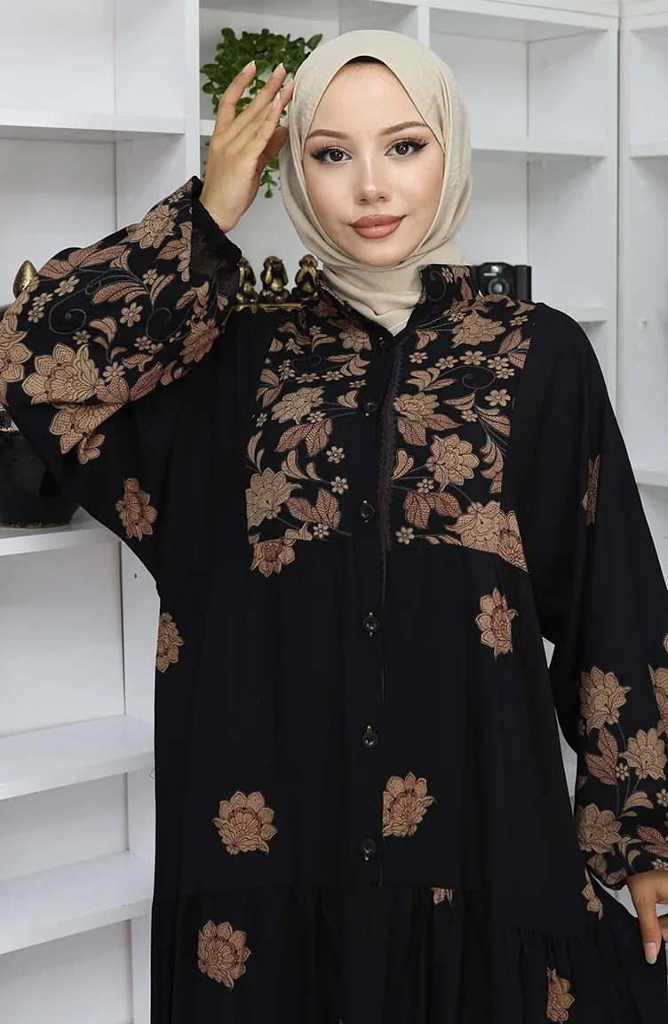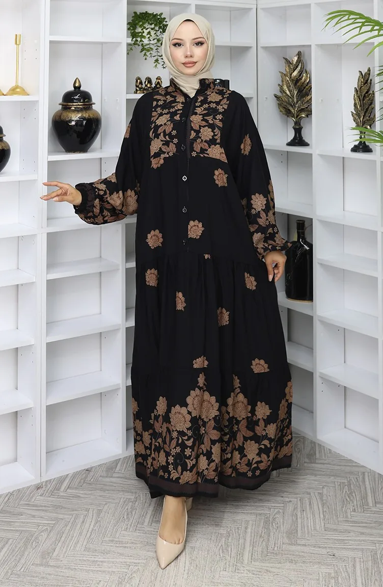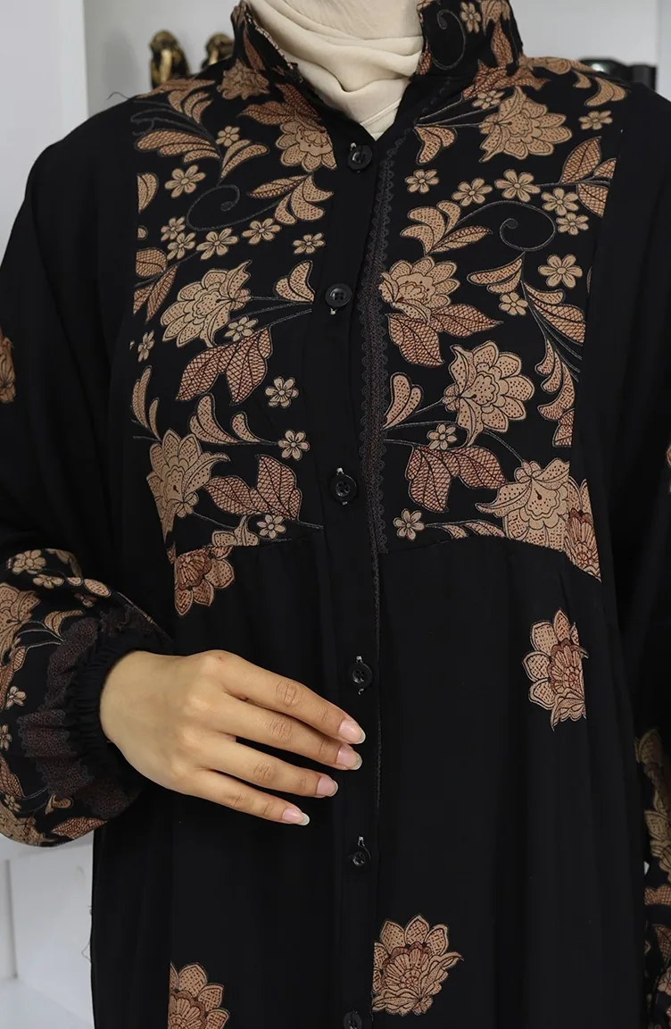 Black color is used. Viscose is a type of synthetic fabric and is convenient to use. Designed with patterned fabric. Buttons have been used to make it easy to use. It's made of elastic sleeves. Tippet collar is prefered. Suitable for 4 seasons. Rahat. Plus size option available.