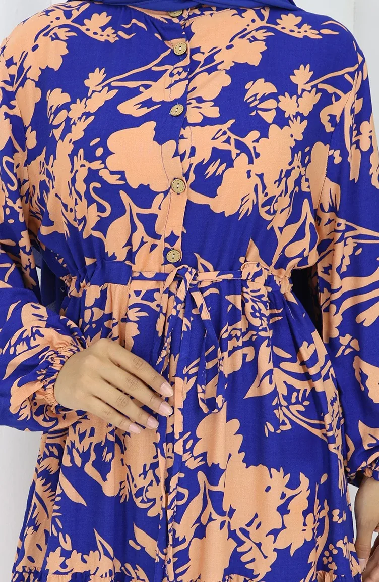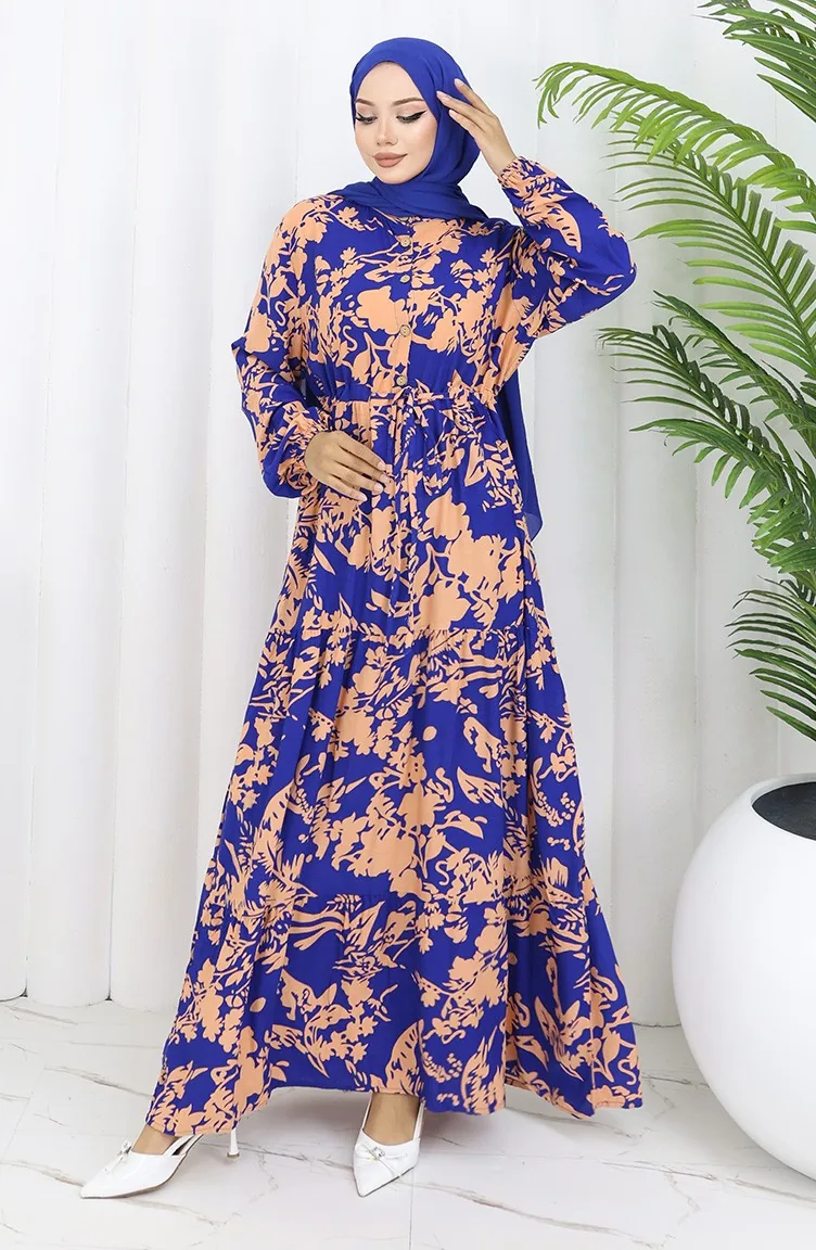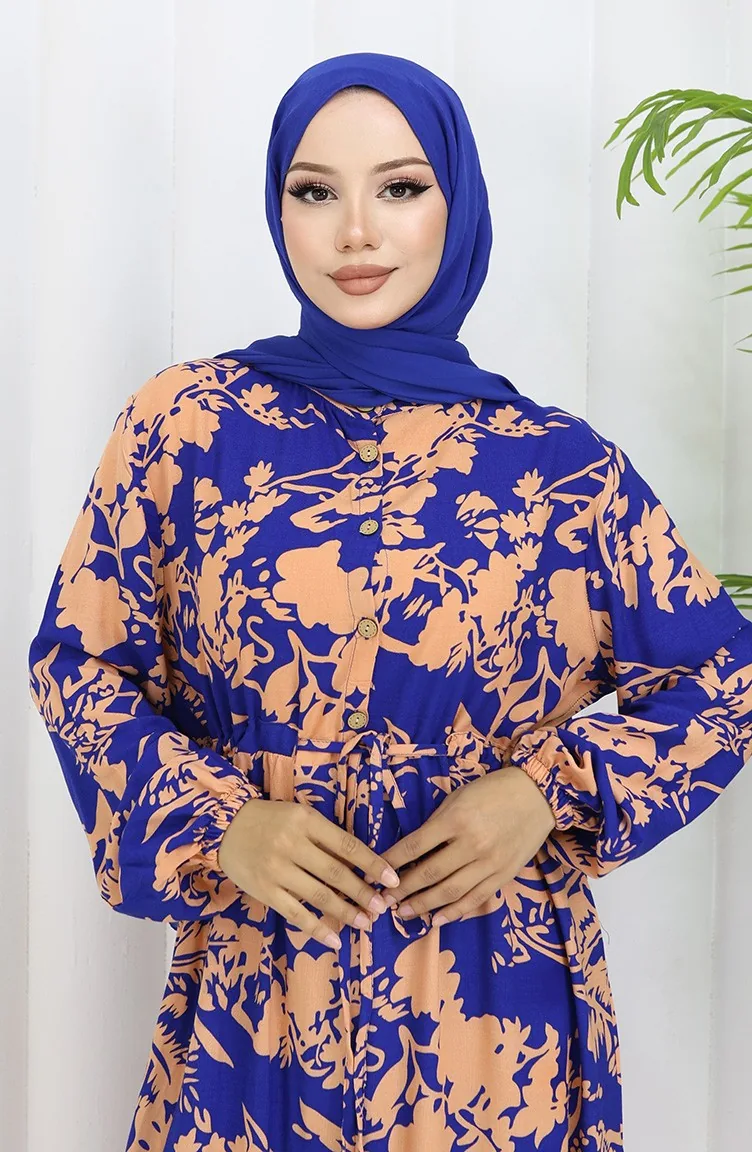Saxon blue color is used. Viscose is a type of synthetic fabric and is convenient to use. Designed with patterned fabric. Buttons have been used to make it easy to use. It's made of elastic sleeves. Tippet collar is prefered. Suitable for 4 seasons. Rahat. Plus size option available.