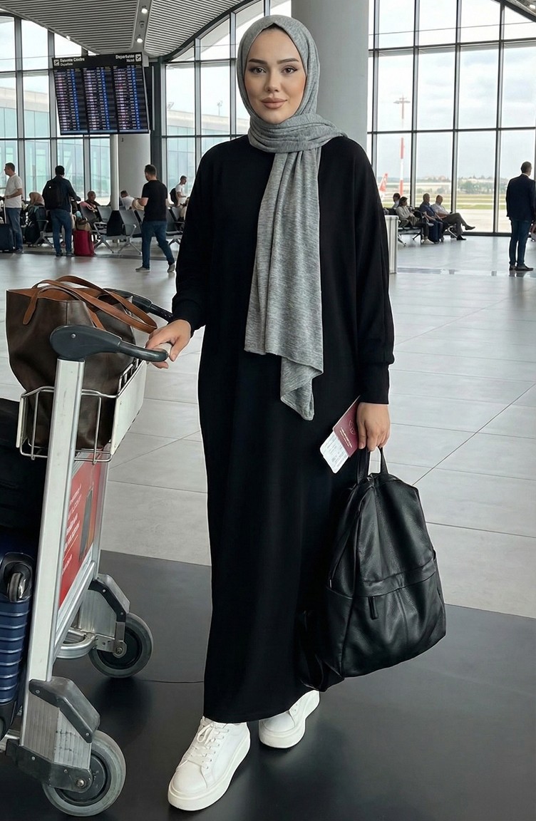 Black color is used. Designed by Gauze fabric. It has a plain appearance. It has batwing sleeve. The Zero collar is preferred for all types of clothing. Suitable for 4 seasons. The size worn by the model, is the one on the image.