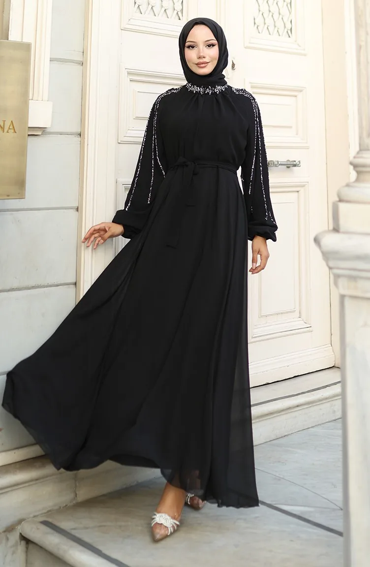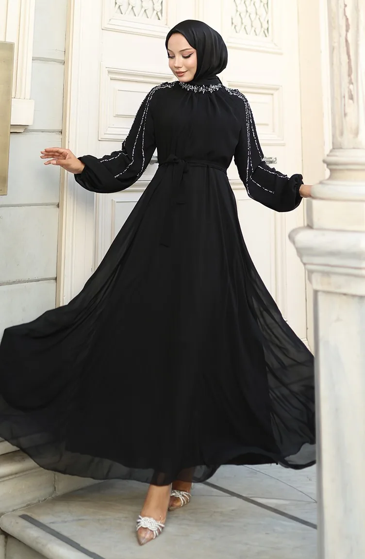 Chiffon Avondjurk Met Stenen Mouwen 5804-01 Zwart 5804-01