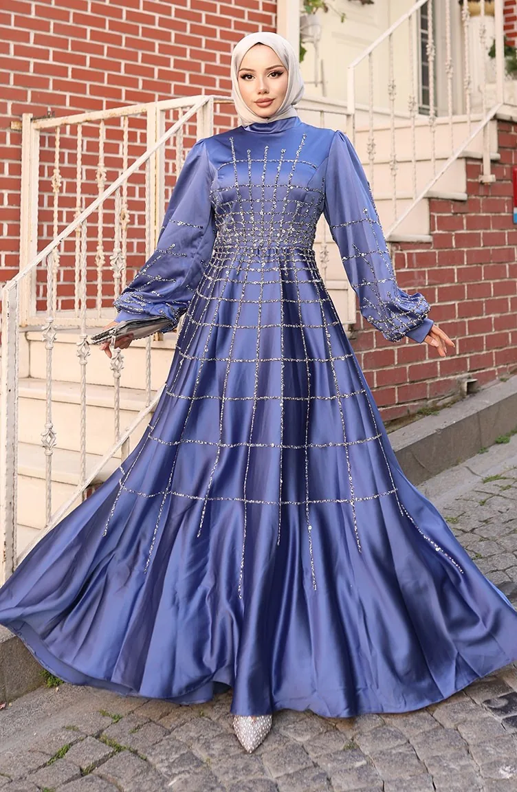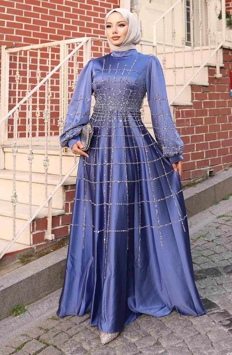 Indigo color is used. The satin fabric has an elegant texture, pleasant and precise in terms of appearance compared to other types. It has a plain appearance. The product is used unlined. The Zero collar is preferred for all types of clothing. Suitable for 4 seasons. Plus size option available.