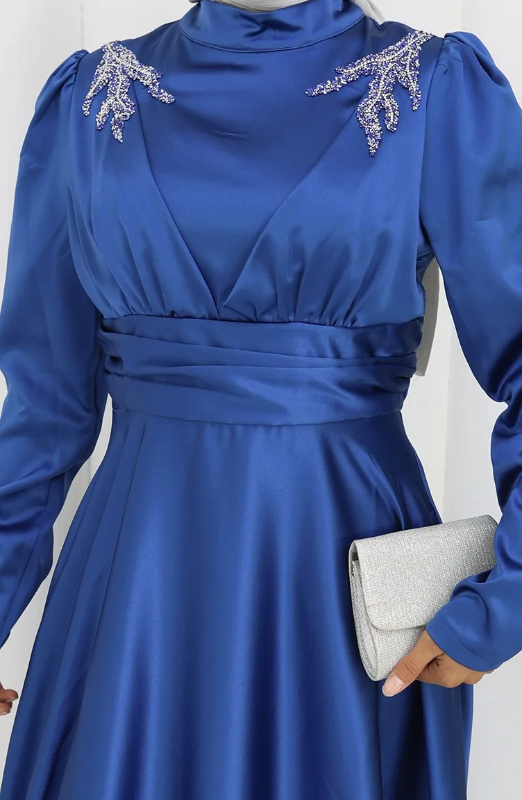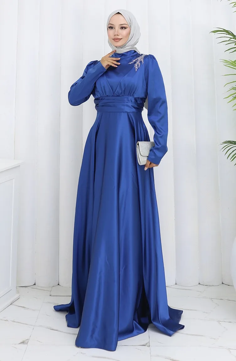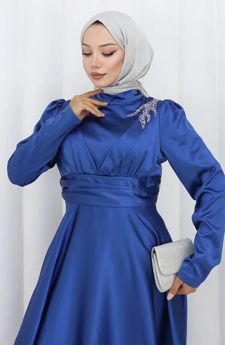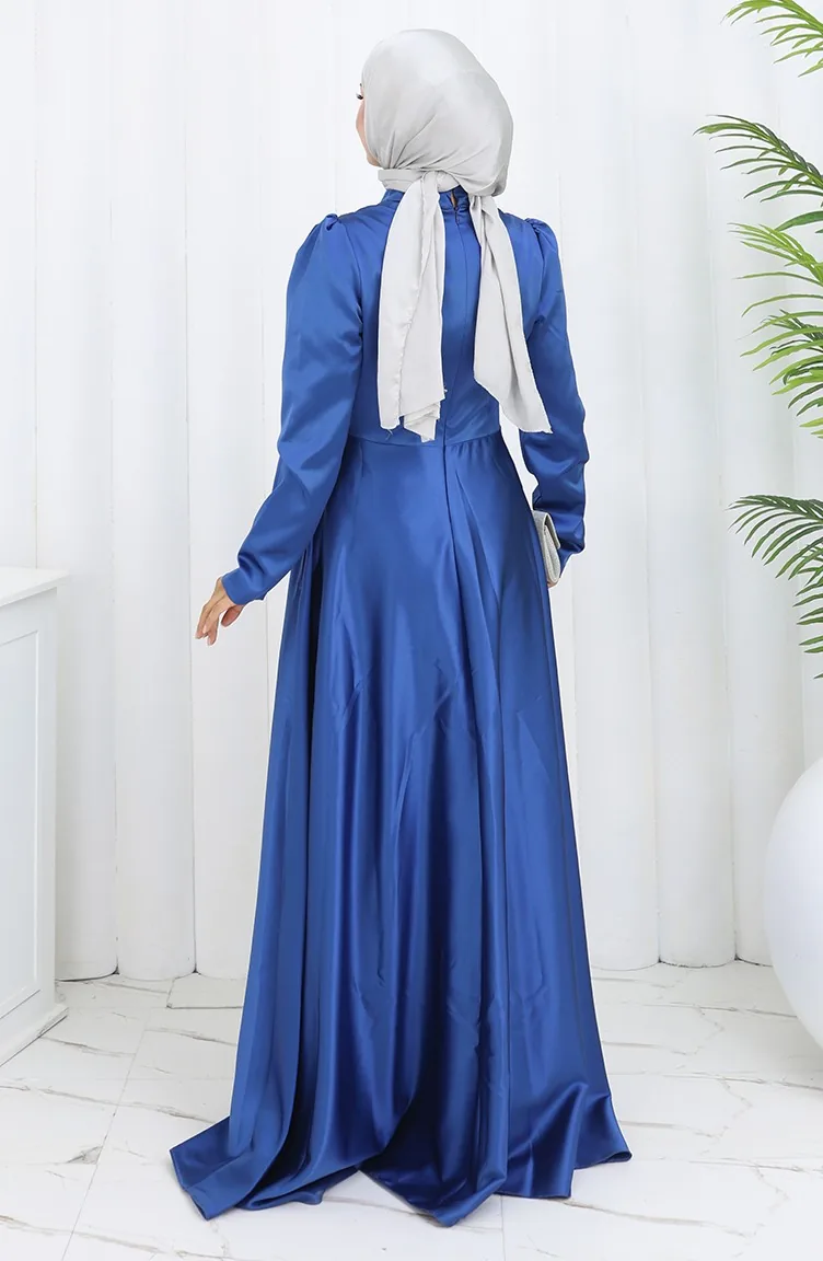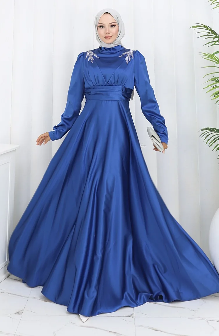 Oil Blue color is used. The satin fabric has an elegant texture, pleasant and precise in terms of appearance compared to other types. It has a plain appearance. Since the fabric thickness of the model is in the middle level, the liner is used. Long sleeve product. Tippet collar is prefered. Suitable for 4 seasons. Plus size option available.