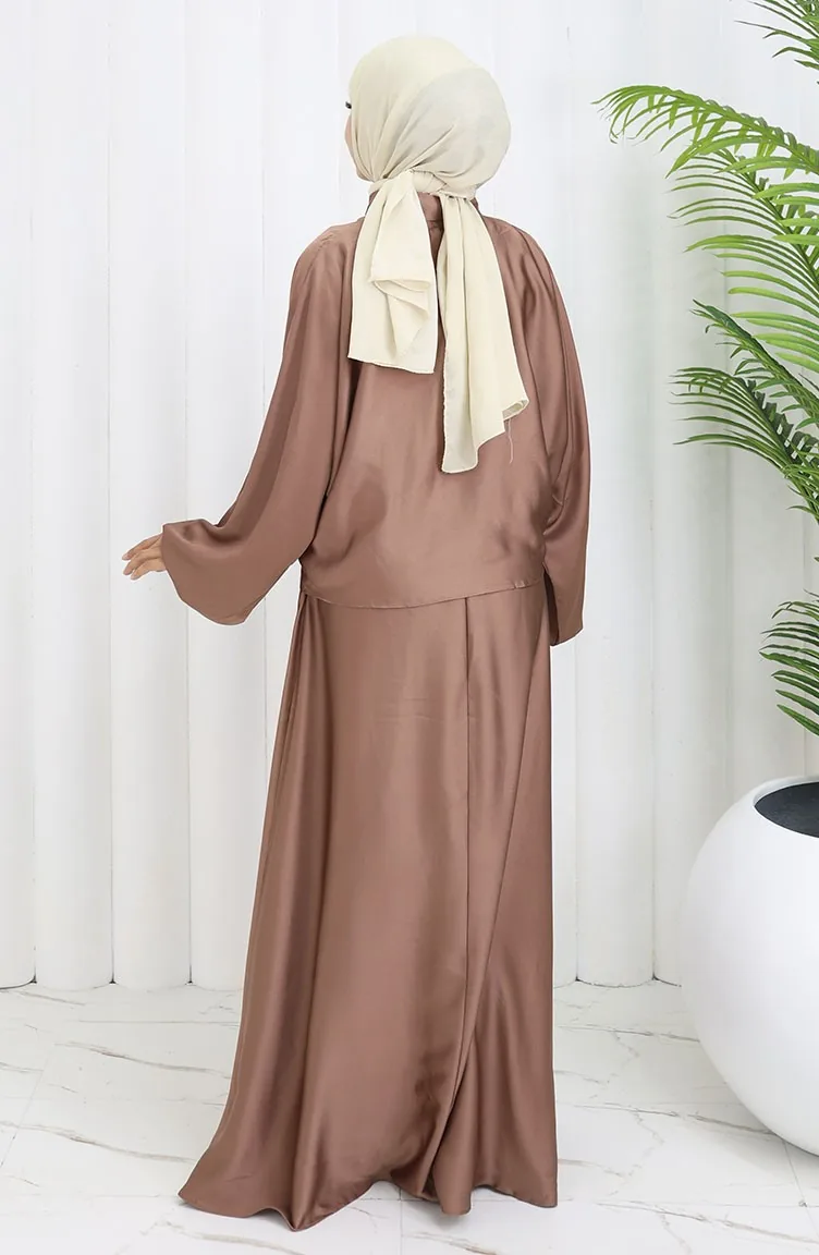 The satin fabric has an elegant texture, pleasant and precise in terms of appearance compared to other types. It has a plain appearance. The product is used unlined. It has batwing sleeve. Suitable for 4 seasons. Şık. Woman. The size worn by the model, is the one on the image.