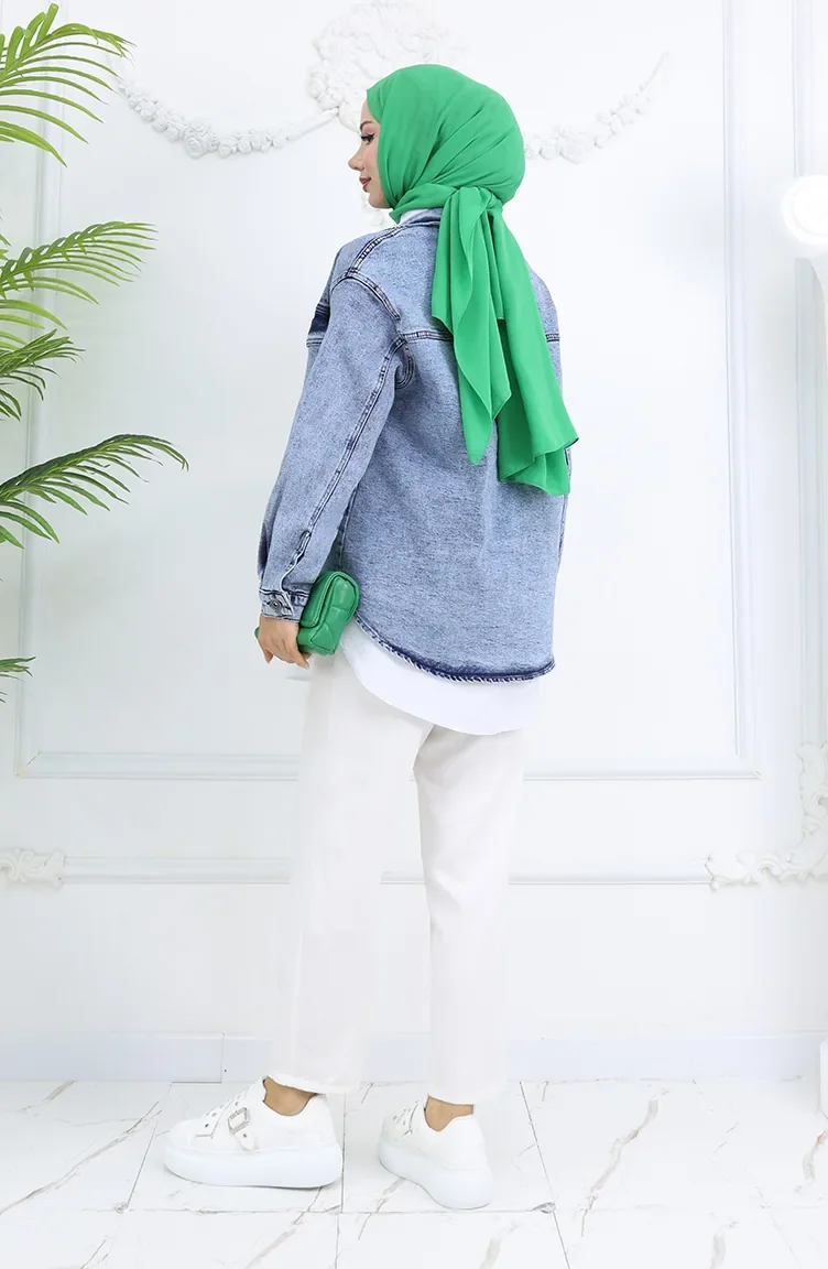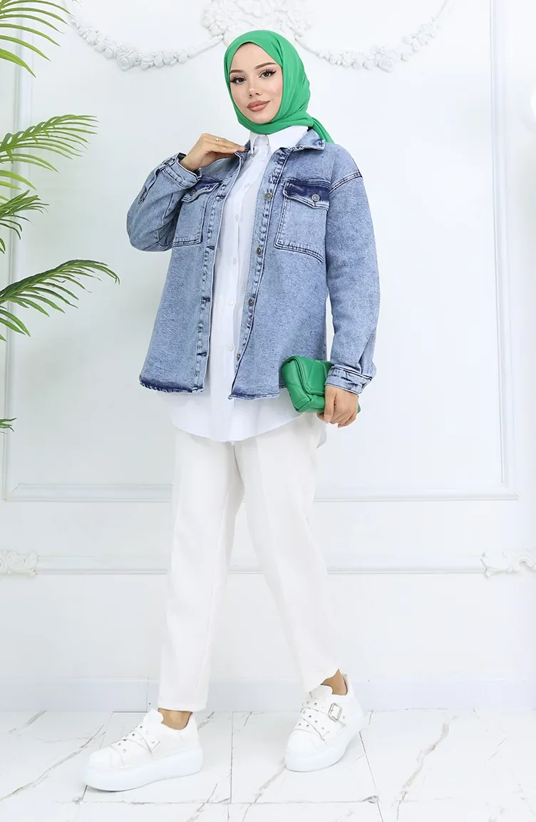 Light blue color. It has a plain appearance. Buttons have been used to make it easy to use. Suitable for 4 seasons. The size worn by the model, is the one on the image.