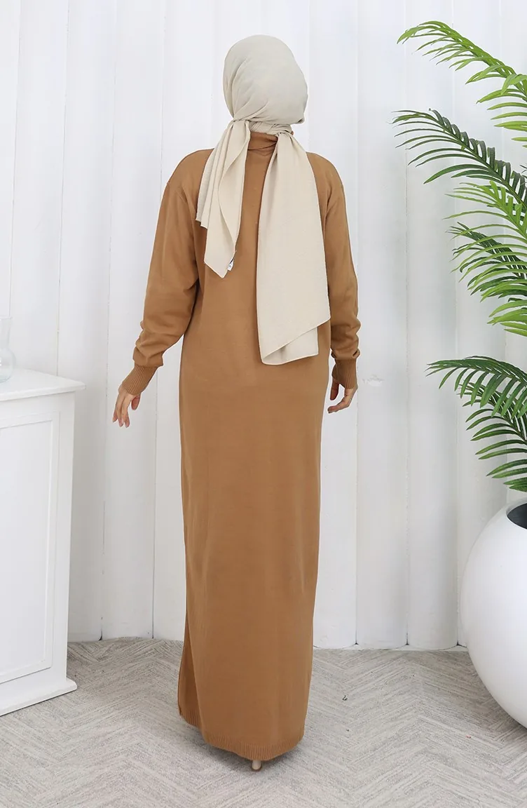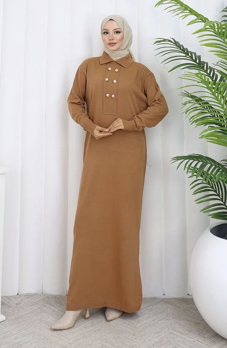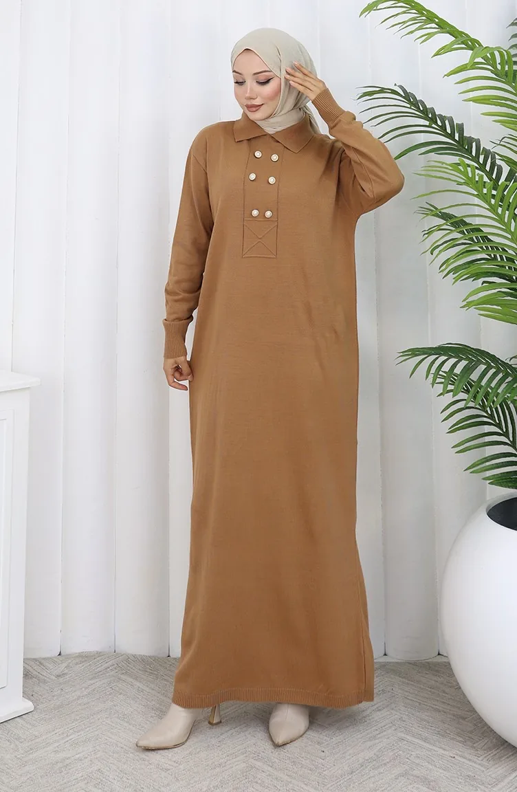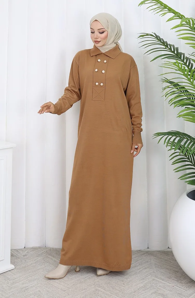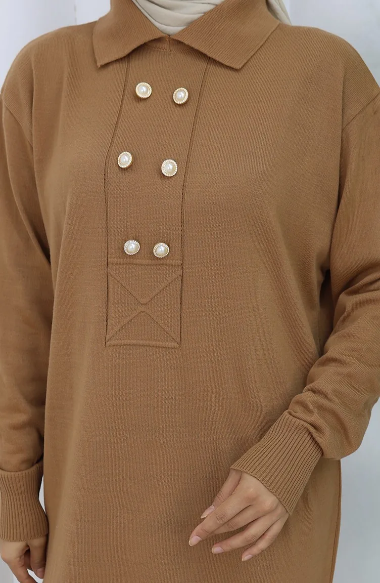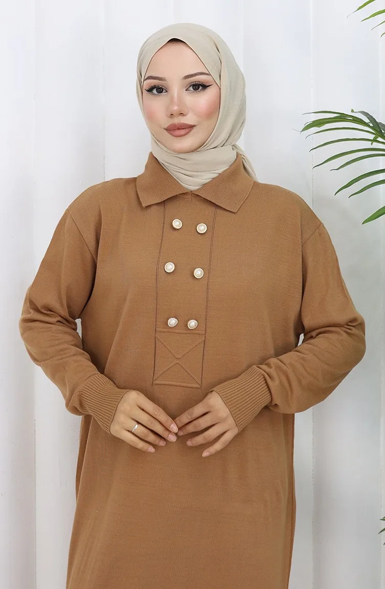 Gebreide Polokraag Met Knoopdetailjurk 0007-08 Melkkoffie 0007-08