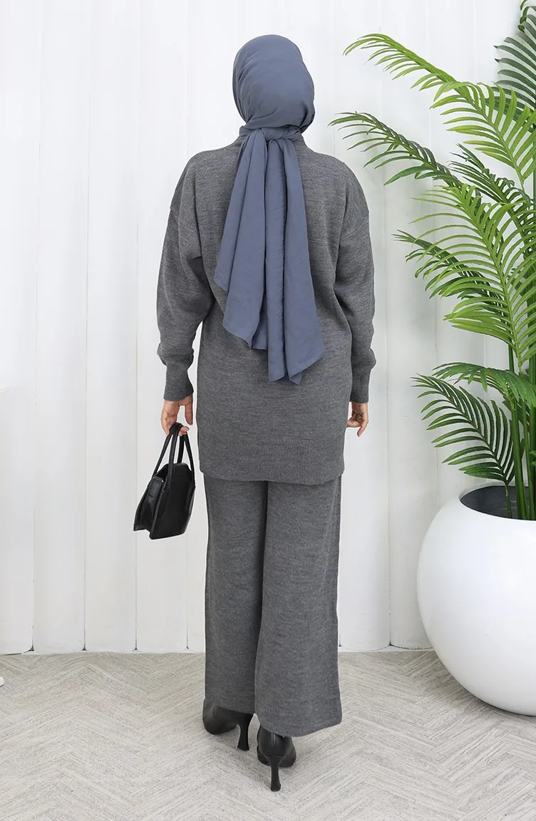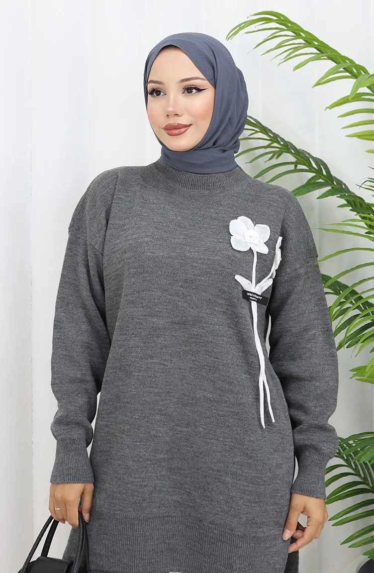 Gebreid Bloemenpatroon Tuniek Broek Tweedelig Pak 1037-08 Grijs 1037-08